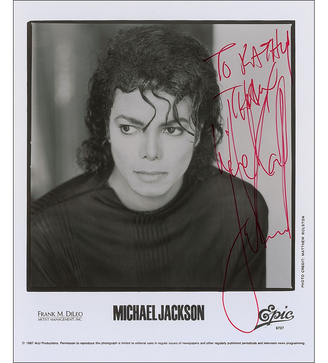 Glossy 8 x 10 Epic Records publicity photo, signed and inscribed in red felt tip “To Kathy, Michael Jackson.” In fine condition.