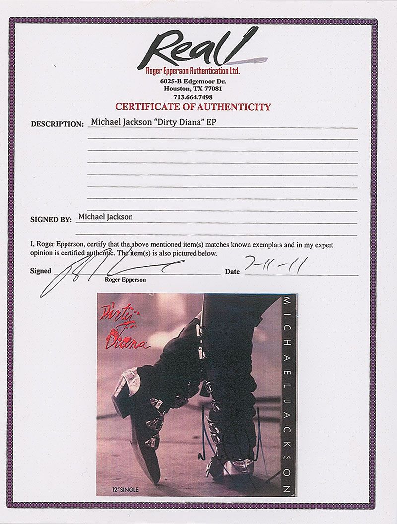 Dirty Diana album signed on the front cover in black felt tip. In fine condition, with a ding to the top edge and a couple mild creases. The record is included. Accompanied by a full letter of authenticity from Roger Epperson/REAL.