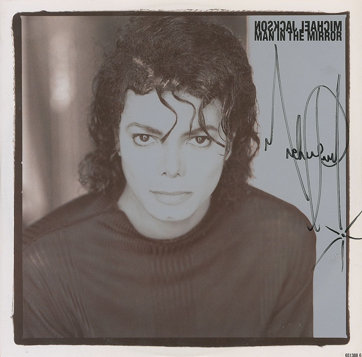 Man in the Mirror 12-inch single signed on the front of the sleeve in black felt tip. In fine condition, with slight irregularity to the finish above the signature. The record is included.