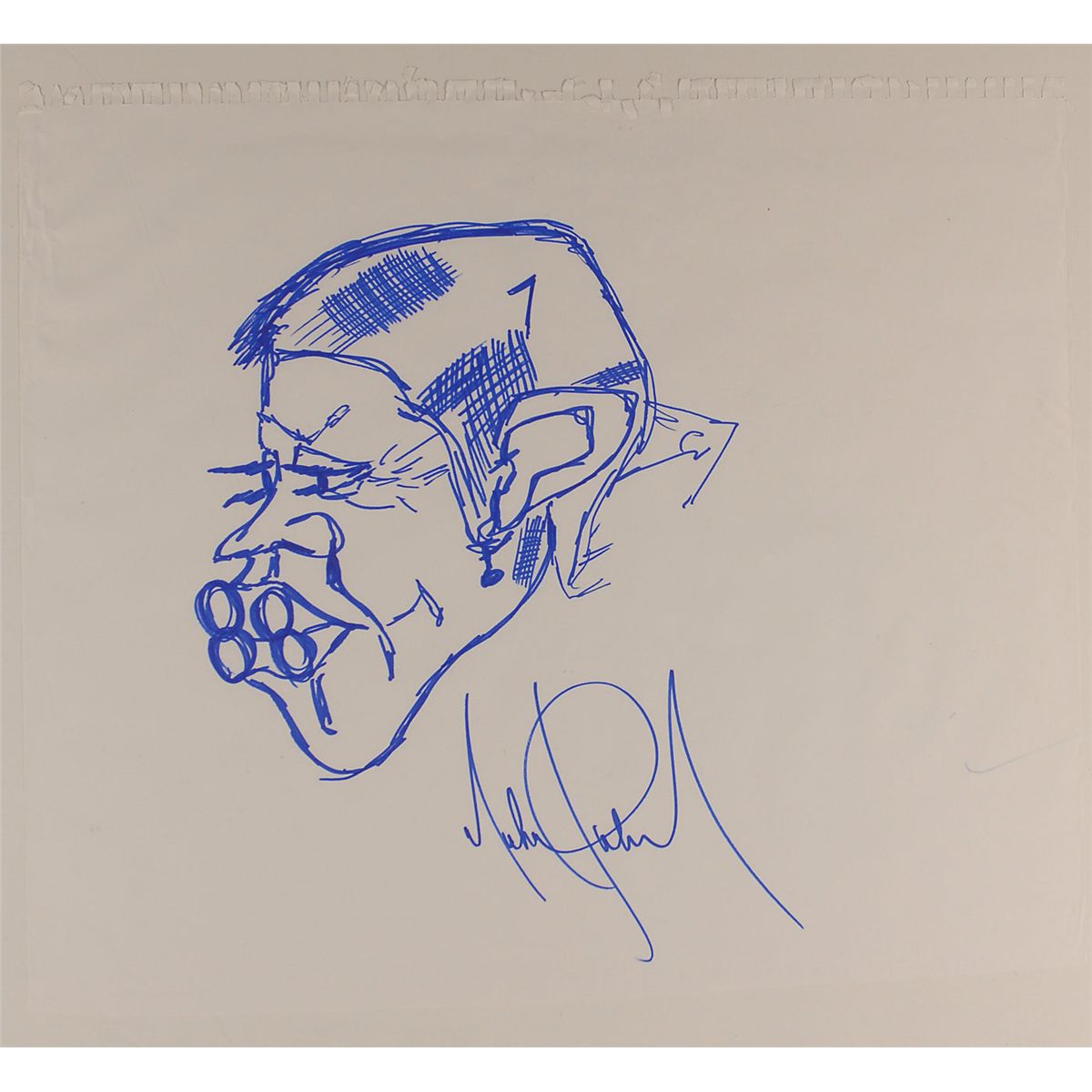 Original felt tip sketch of a man with double lips on an off-white 18 x 15 sheet, signed at the bottom “Michael Jackson.” In fine condition, with original art pad binding holes to top.