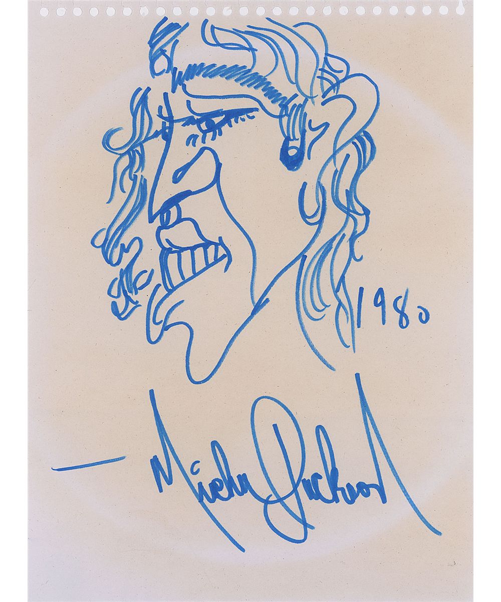 Original felt tip self-portrait, dated 1980, on an off-white 9 x 12 sheet, signed at the bottom “Michael Jackson.” Light scattered toning and rippling, and original art pad binding holes to top, otherwise fine condition.