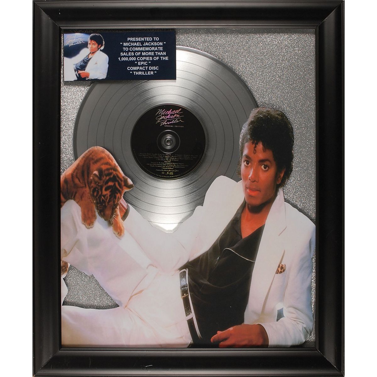 Sales award presented to Jackson to commemorate the sale of one million copies of the Thriller CD. Framed with a special edition of the disc, a platinum disc, a printed plaque featuring the album art, and a cut-out of Jackson as he appeared on the album, to an overall size of 19 x 23. In fine condition. Accompanied by a letter from the national marketing director of Sony Music identifying the award.