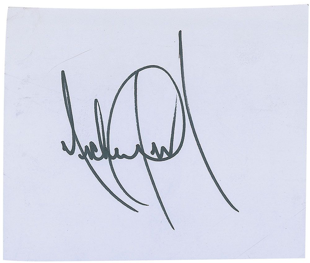 Crisp and bold felt tip signature, “Michael Jackson,” on a white 4.5 x 3.75 sheet. In fine condition.