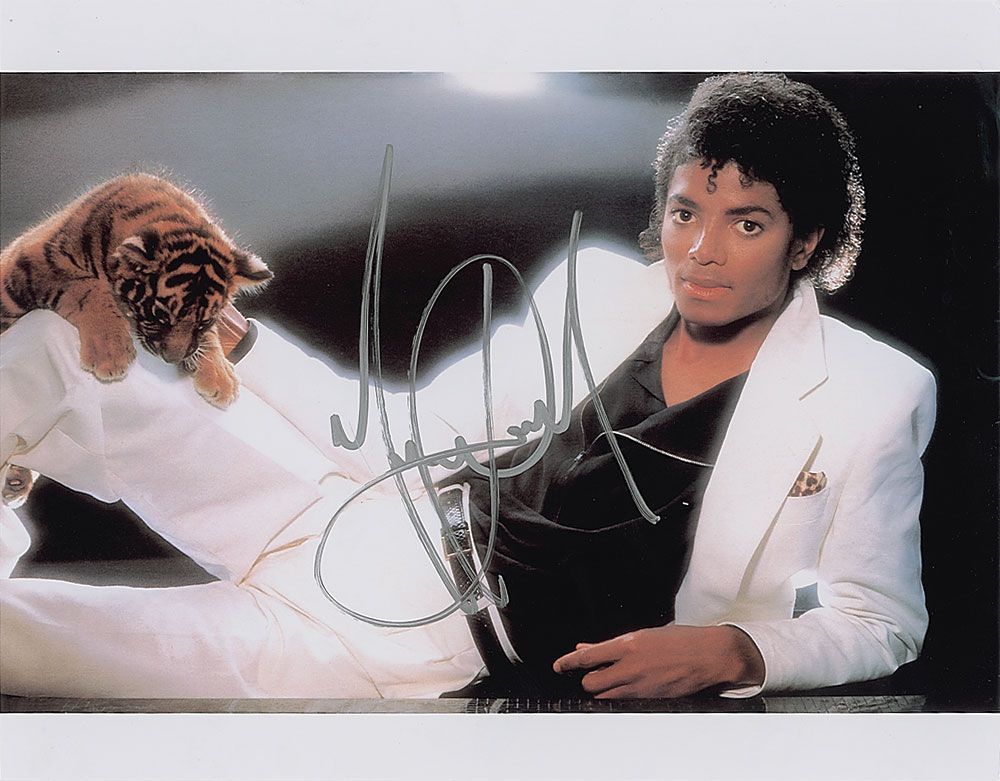 Color glossy 14 x 11 photo of Jackson in a white suit with a tiger cub on his knee, signed in silver ink. In fine condition.