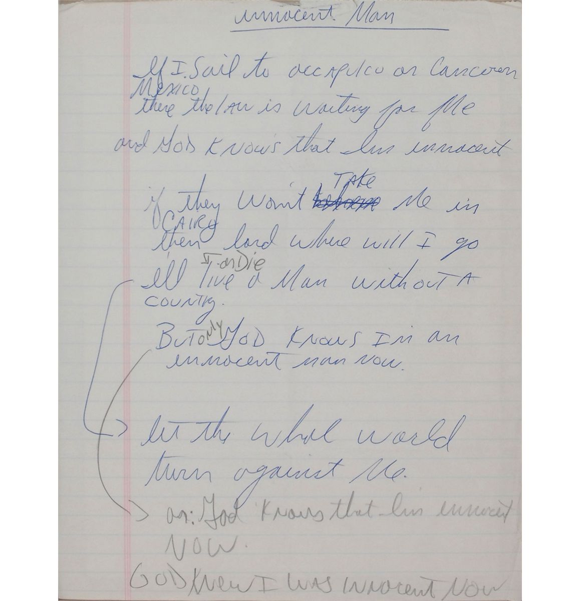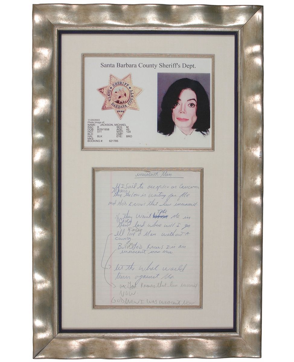 Handwritten working lyrics to ‘An Innocent Man,’ one lined page, 8.25 x 10.75, circa 1993. Jackson pens preliminary lyrics for the song in blue ballpoint, later editing and adding notations in pencil. In full (spelling and grammar retained): “If I sail to Accapulco or Cancoon / Mexico / There the law is waiting for me / and God knows that I’m innocent / if they won’t take me in / Cairo / then lord where will I go / I’ll live or die a man without a / country / But only God knows I’m an / innocent man now. / let the whol world / turn against me. / or: God knows that I’m innocent / Now. / God knew I was innocent now.” Cloth-matted and framed with an image of Jackson’s mug shot to an overall size of 18 x 28. In fine condition, with three horizontal folds and scattered wrinkling. Written at the height of the 1993 child sexual abuse accusations against him, Jackson’s words are deeply personal and revealing of his inner thoughts during one of the most difficult periods of his life.