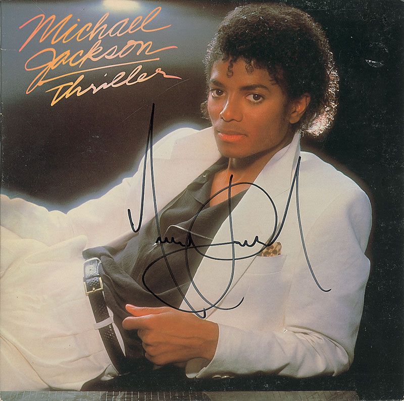 Thriller album nicely signed on the front cover in black felt tip. In fine condition, with some light cover wear and creases and a small label remnant to top right. The record is not included. Accompanied by a certificate of authenticity from Roger Epperson/REAL.