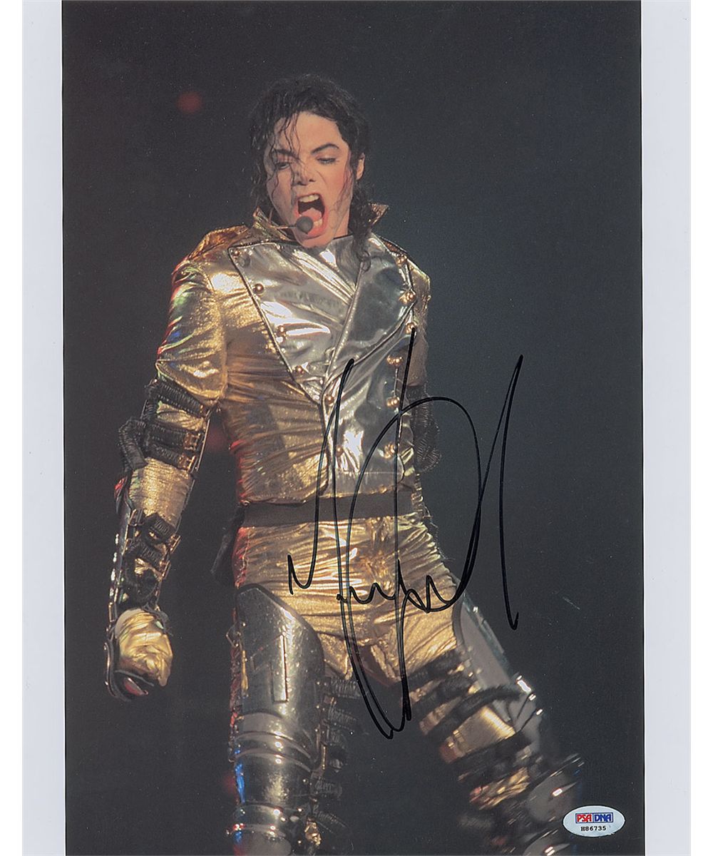 Color glossy 11 x 14 photo of Jackson on stage in a gold suit and black pads, signed in black felt tip. In fine condition, with a PSA/DNA authentication label affixed to lower corner. Accompanied by a certificate of authenticity from PSA/DNA and a full letter of authenticity from Roger Epperson/REAL.