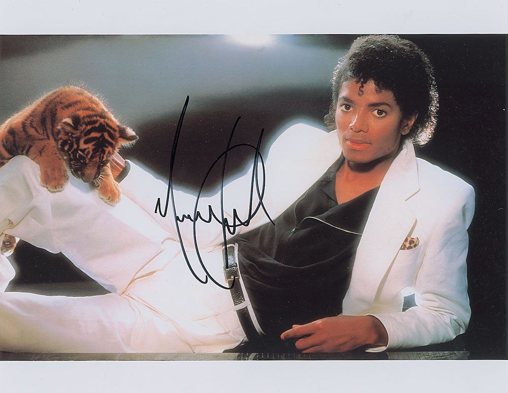 Color glossy 14 x 11 photo of Jackson in a white suit with a tiger cub on his knee from Thriller, signed in black felt tip. In very fine condition. Accompanied by a full letter of authenticity from Roger Epperson/REAL.