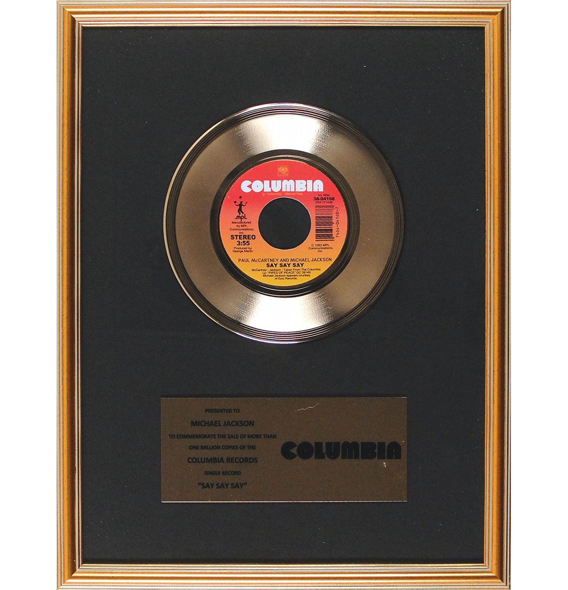 Columbia in-house gold record award on a black mat, presented to Michael Jackson “to commemorate the sale of more than one million copies of the Columbia Records single record ‘Say Say Say.’” Framed with the gold disc and engraved plaque to an overall size of 13 x 17. Bears a New York Picture & Frame Co. sticker affixed to a black backing. In very fine condition.