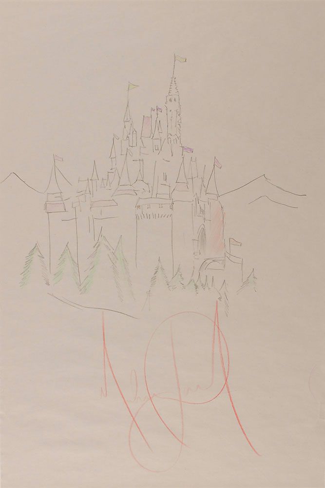Original signed pencil and colored pencil sketch of a six-flagged castle nestled in the woods with a mountain range in the distance, on an off-white 12 x 18 sheet, signed at the bottom in red artist’s pencil by Jackson. In fine condition. The subject of this sketch is likely Neuschwanstein, the basis for Disney’s Sleeping Beauty Castle, as this came from a collection of drawings Jackson did of Disney characters.