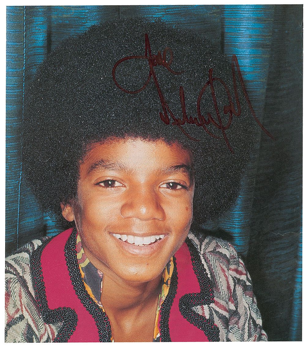 Color 10 x 11.75 book photo of a young Michael, signed in red felt tip, “Love, Michael Jackson.” In very good condition, with moderate contrast to signature and some light mounting remnants to reverse.