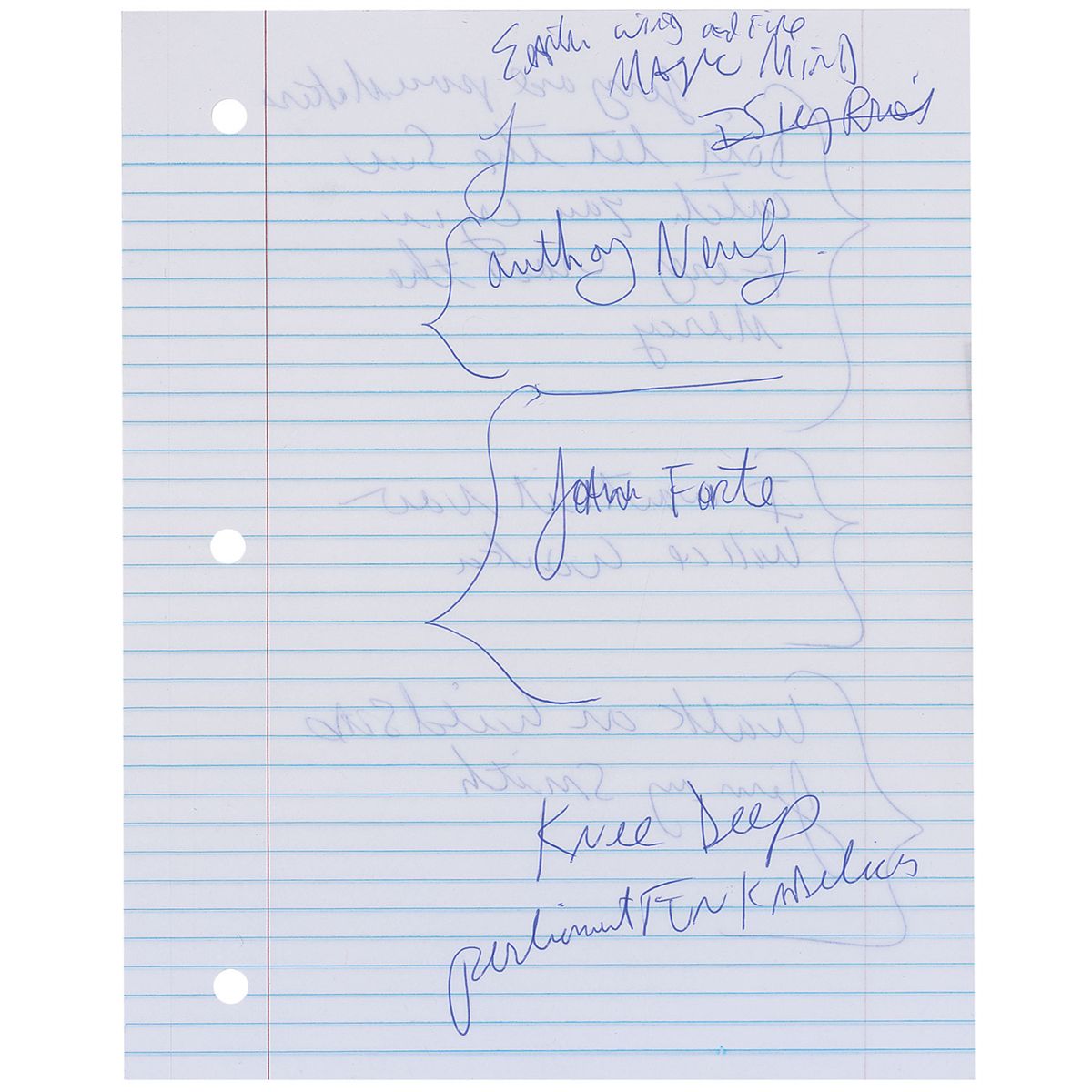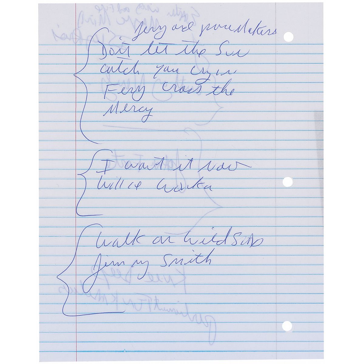 Unsigned handwritten notes on both sides of an 8.25 x 10.5 sheet of lined loose-leaf paper. Jackson pens 16 notes, all of which appear to be band names or song titles. Some of the notes read (with grammar and spelling retained), “Earth Wind and Fire Magic Mind,” “Knee Deep Parliiment Funkadelics,” “Jerry and pacemakers Dont’ Let the sun catch you cryin, Ferry cross the mercy,” “I want it now Willie Wonka,” and “Walk on Wild Side Jimmy Smith.” In fine condition, with a few light bends and creases. An interesting list which shows Jackson’s appreciation of other musical styles which in turn helped shape his own unique style.