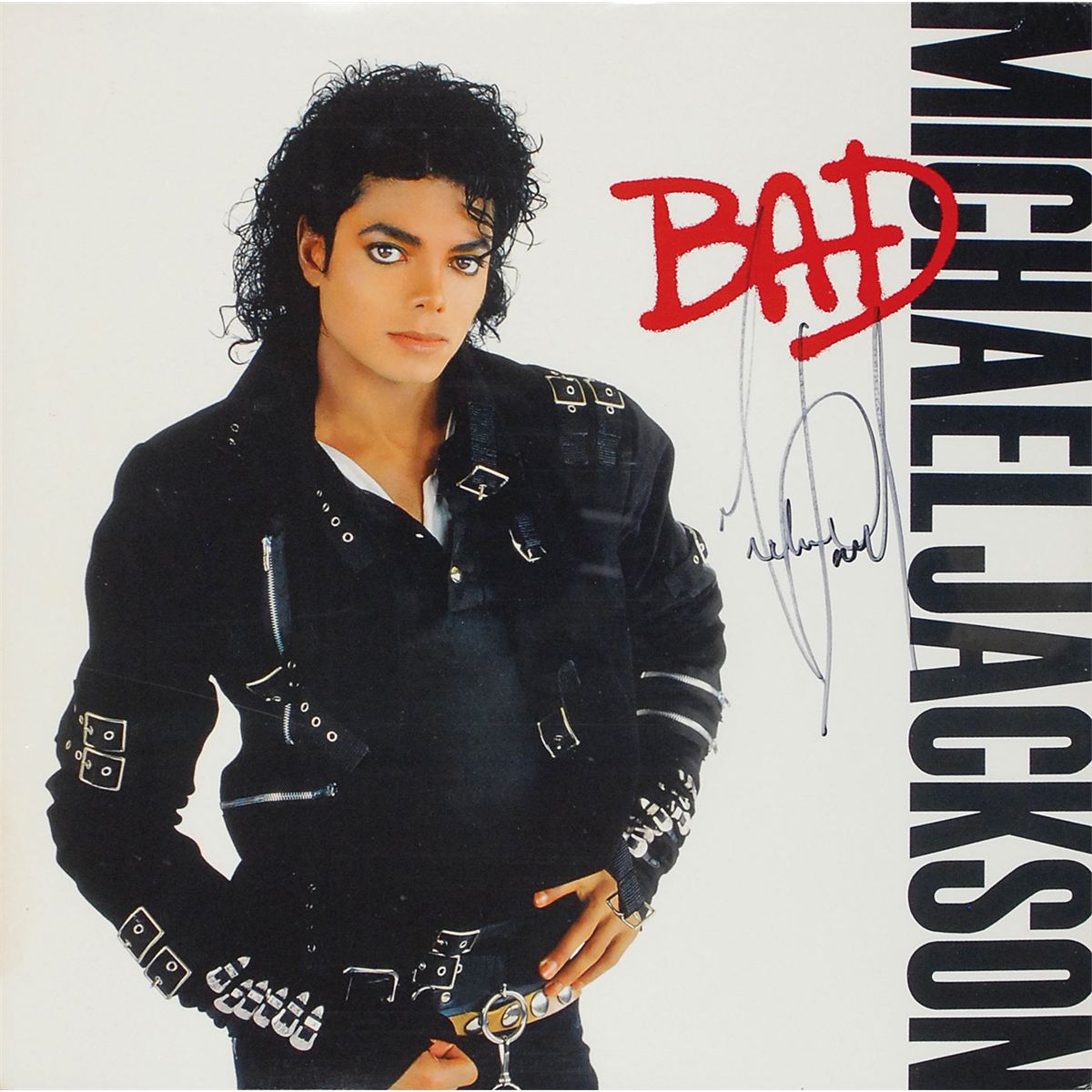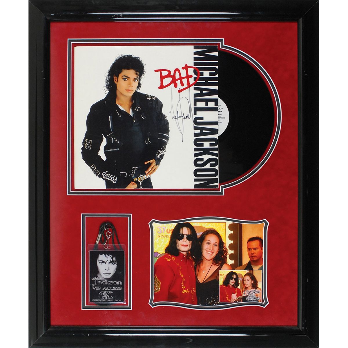 Bad album signed on the front cover in black felt tip. Beautifully double-suede-matted and framed with two photos of Jackson taken at the time of signing during a 2003 VIP event, as well as the VIP pass and lanyard, to an overall size of 25.5 x 30.5. In fine condition. The record is included. Oversized.