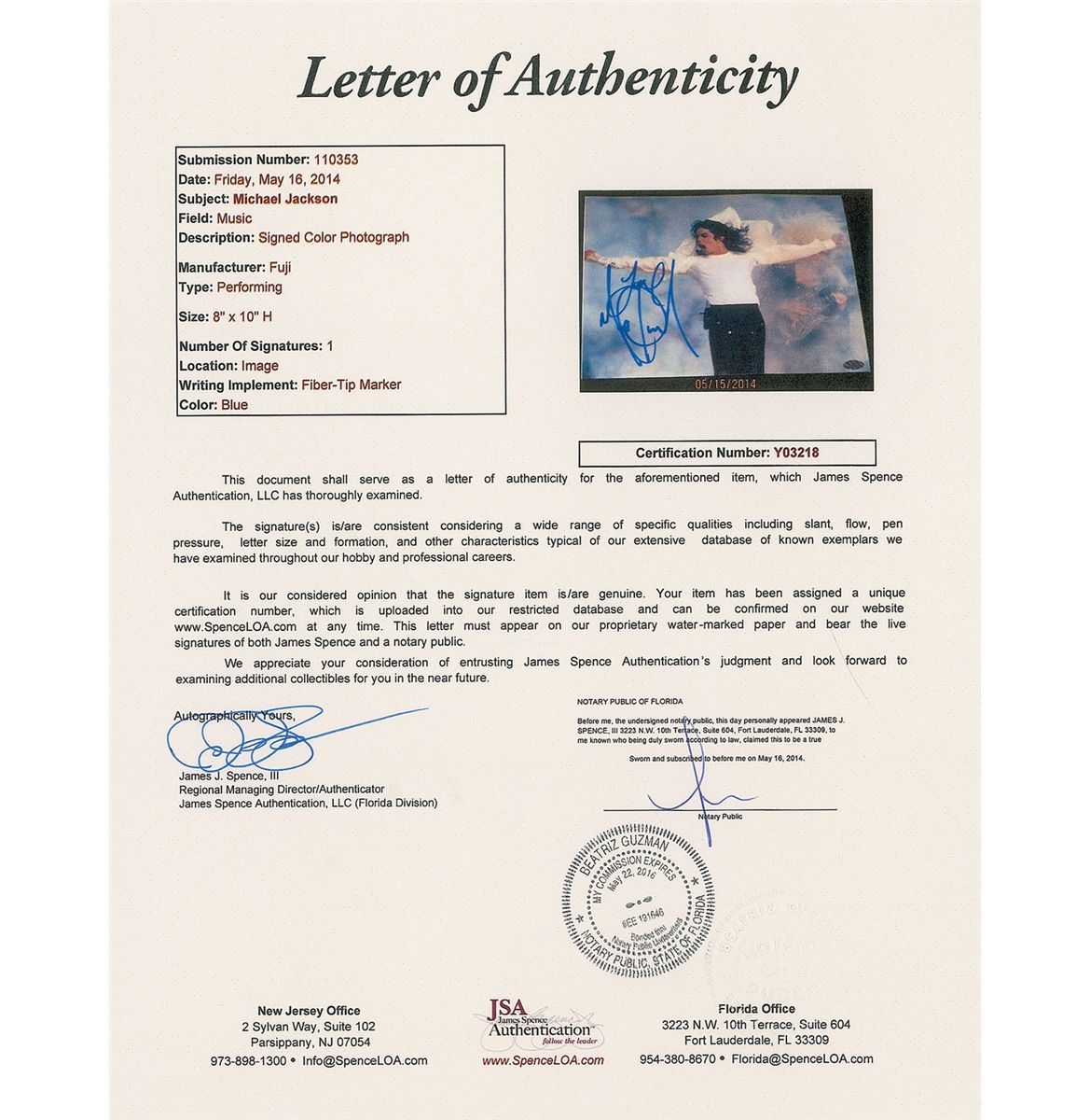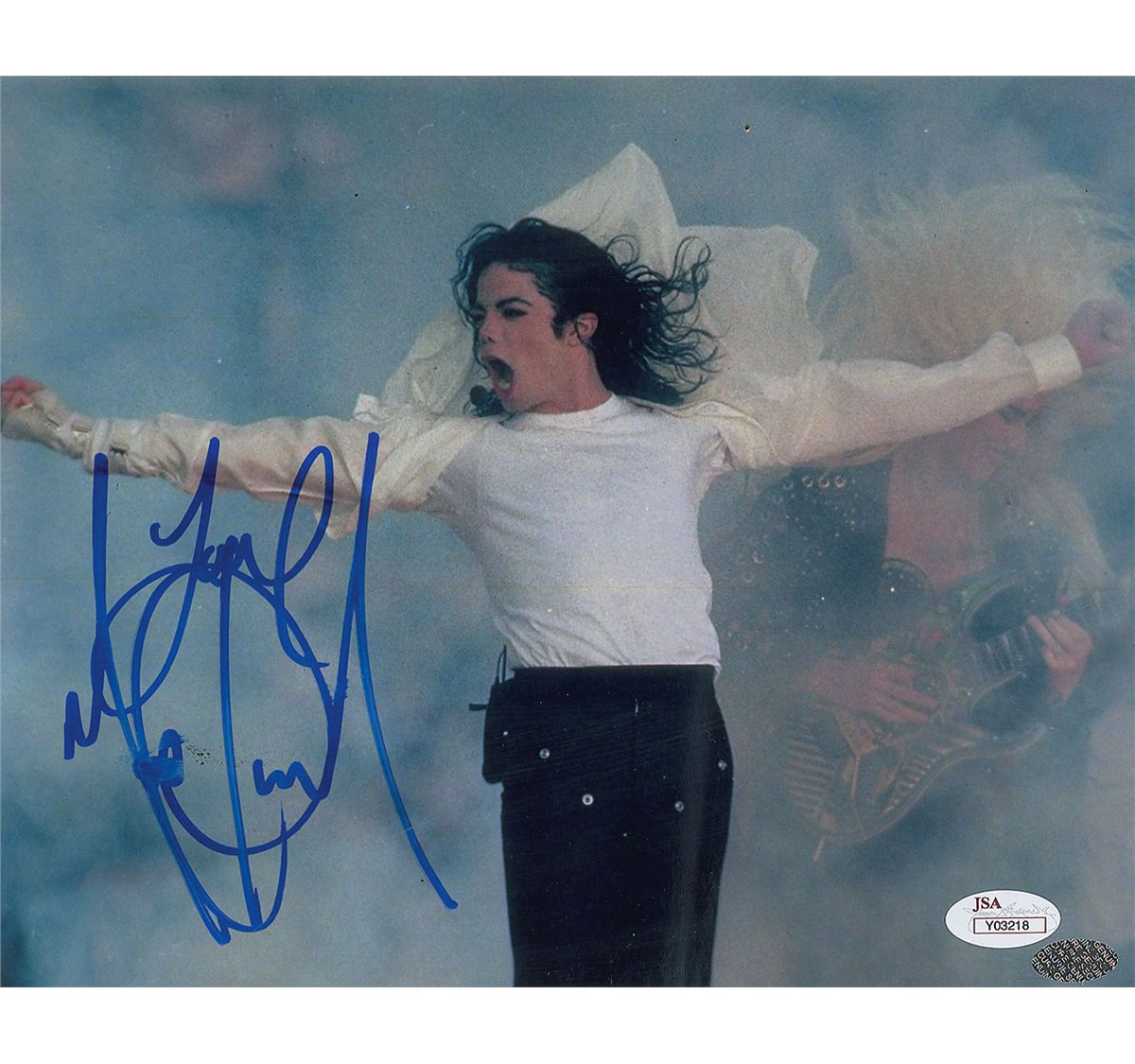 Color glossy 8 x 10 photo of Jackson during an intense performance, signed in blue felt tip, “Love, Michael Jackson.” In fine condition, a JSA label affixed to the lower corner. Accompanied by a certificate of authenticity from JSA.