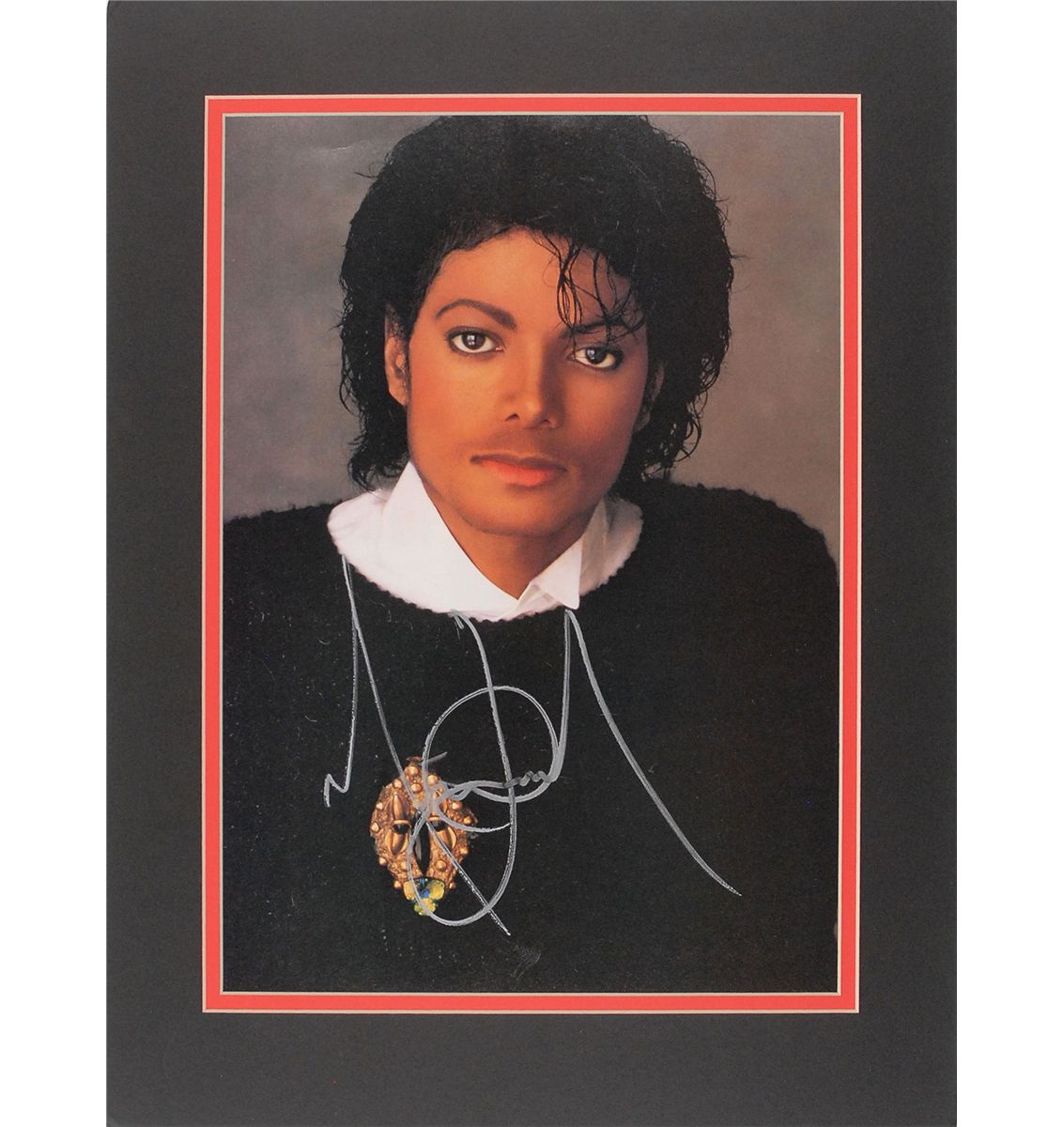Color satin-finish 8.75 x 12.75 photo of Jackson in a black sweater adorned with a large gold pin, signed in silver ink. Double-matted to an overall size of 12.25 x 16.5. In fine condition, with a few scattered light bends and creases.