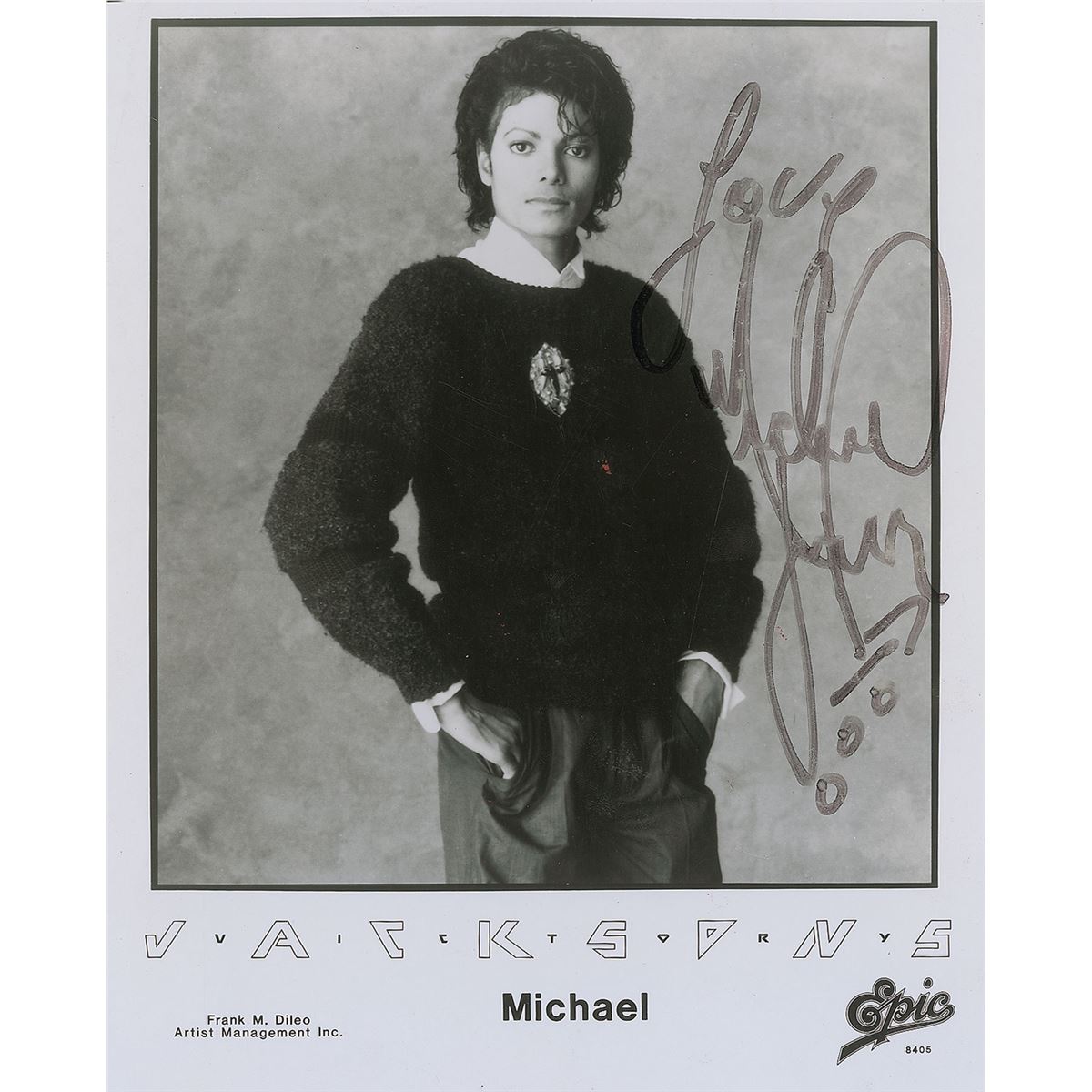 Glossy 8 x 10 Epic Records publicity photo of Jackson for the Jackson 5’s Victory album, signed in black felt tip. A few light bends and irregular ink adhesion to the signature, otherwise fine condition.