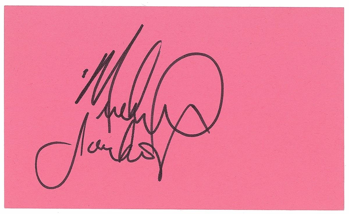 Felt tip signature, “Michael Jackson,” on a pink 5 x 3 card. In fine condition.