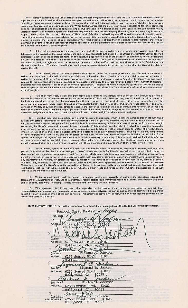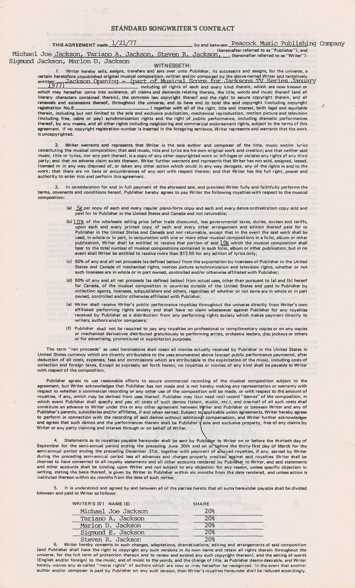 DS, one page both sides, 8.5 x 14, January 21, 1977. Standard songwriters contract between the Jackson 5 and Peacock Music Publishing for the musical piece entitled “Jackson Opening—(part of Musical Score for Jacksons TV Series, January 1977,” with each member of the band receiving a 20% share of the royalties. Signed on the reverse by Michael Jackson, Joseph Jackson, Marlon Jackson, Tito Jackson, and Jackie Jackson, with Tito and Jackie signing with their legal names. In fine condition. The Jackon’s variety show ran for 12 episodes from 1976–1977. The half-hour program featured musical and dance numbers, as well as guest stars including Redd Foxx, Sonny Bono, and Muhammad Ali.