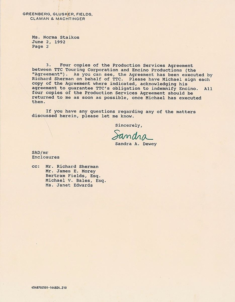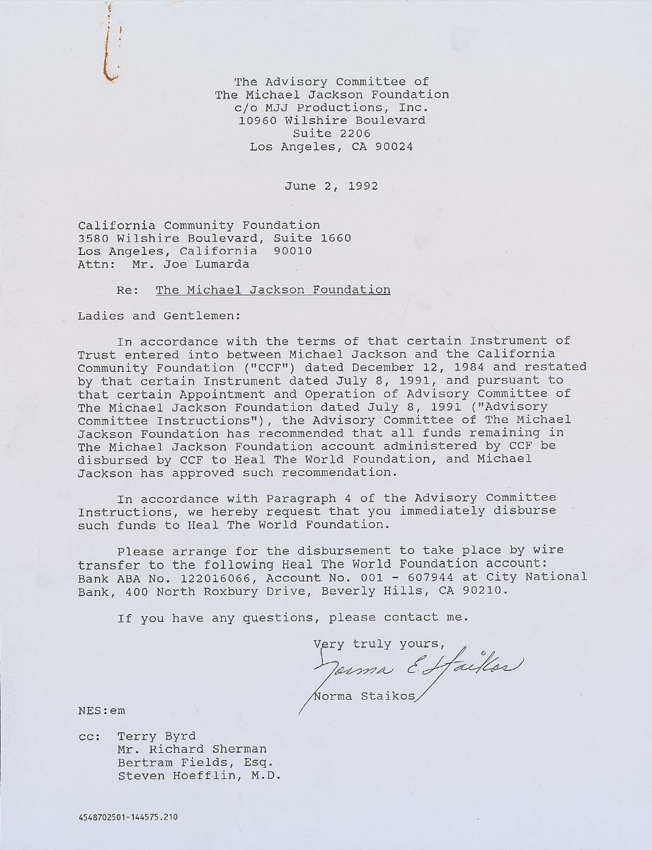 DS, one page, 8.5 x 11, June 2, 1992. Document concerning the disbursement of funds from the Michael Jackson Foundation, in part: “The Advisory Committee of The Michael Jackson Foundation recommends that all funds remaining in The Michael Jackson Foundation account be administered by the California Community Foundation be disbursed by the California Community Foundation to Heal The World Foundation.” Signed at the conclusion in black felt tip by Jackson, also bearing printed facsimile signatures of members of the advisory board. In fine condition, with two paperclip impressions to the top edge and subtle haloing to signature. Accompanied by a printed cover letter and a photocopied letter from a law firm regarding the transaction. Jackson founded the Heal the World Foundation in 1992, inspired by his charitable single of the same name. The organization’s mission was to improve the conditions for children throughout the world, fighting hunger, homelessness, and disease. An important document from the founding period of Jackson’s well-known charity.