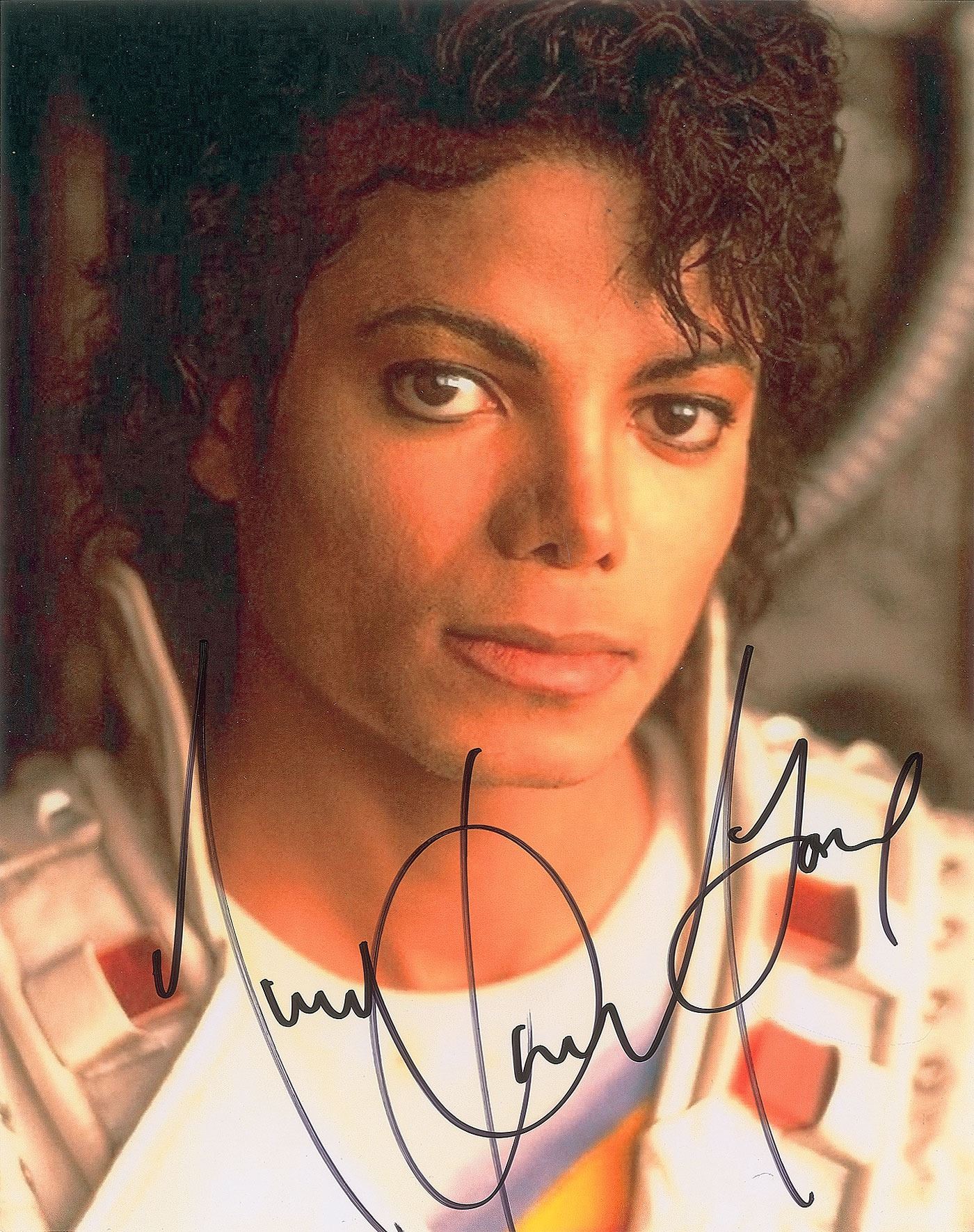 Color glossy 8 x 10 close-up photo, signed in black felt tip, "Love, Michael Jackson." In fine condition, with a slightly grainy quality to the image.