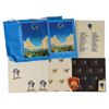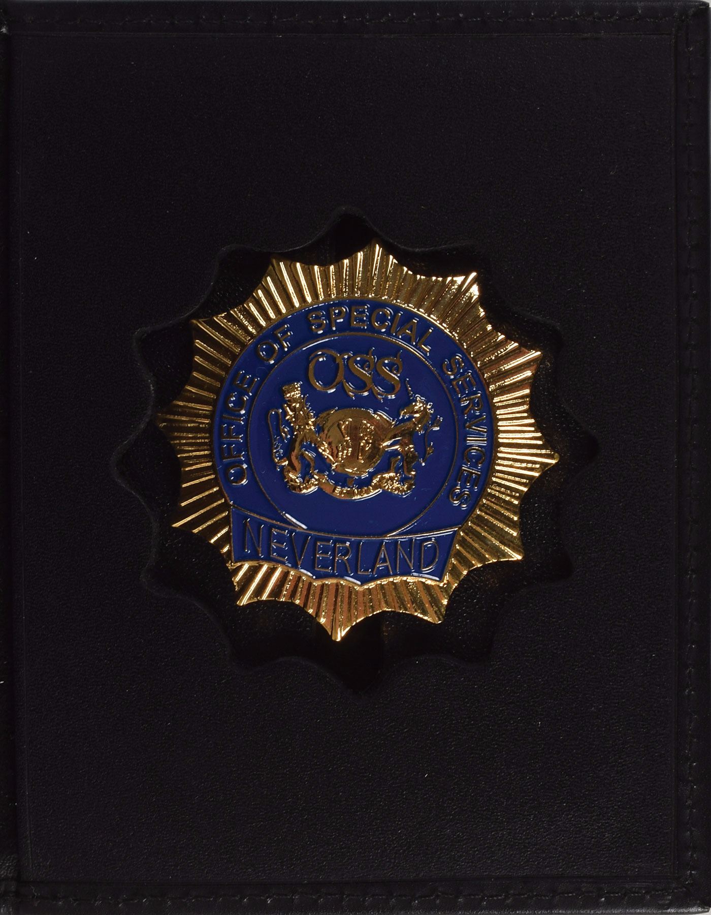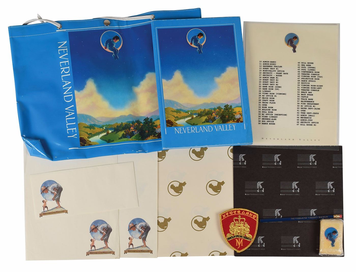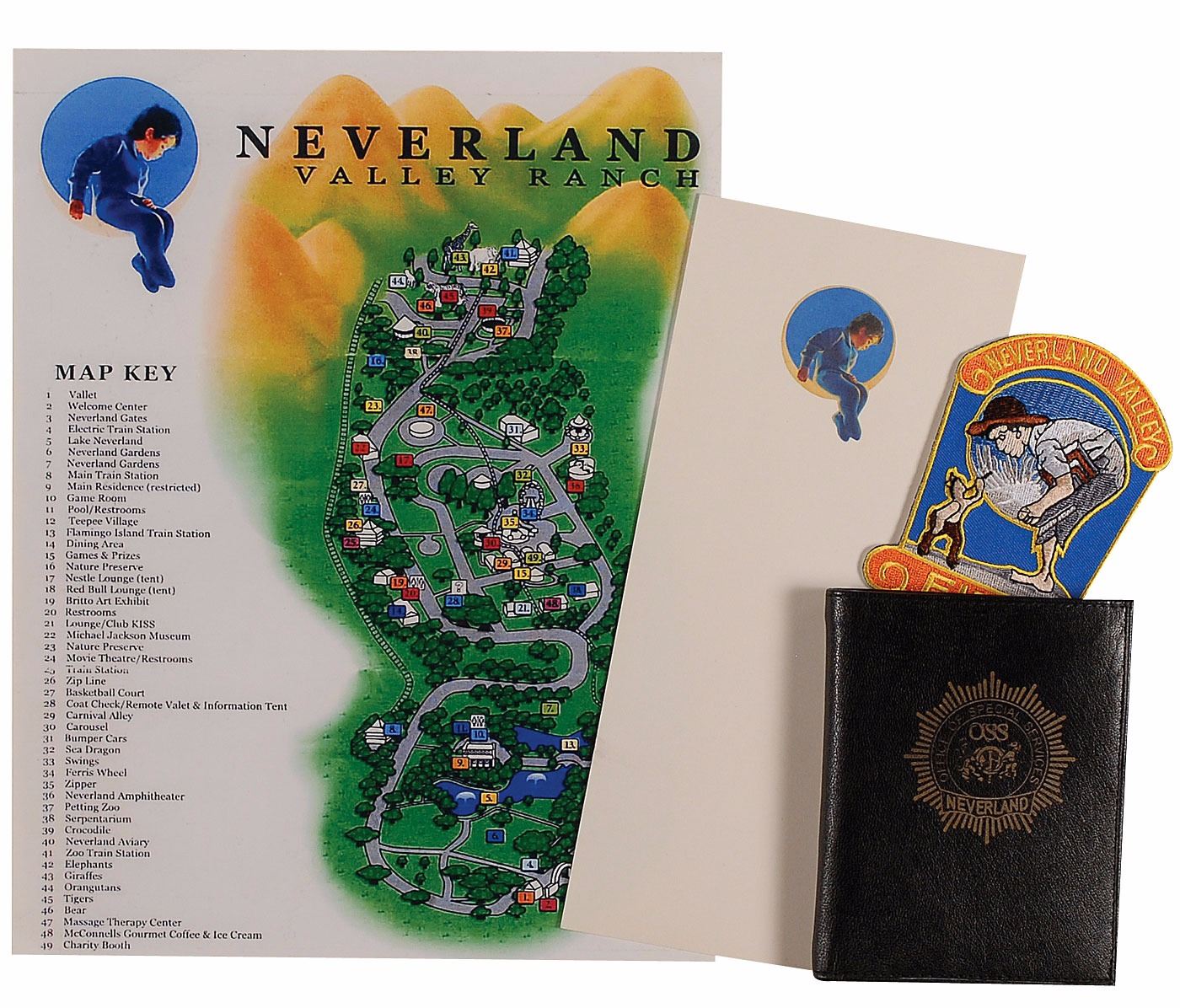 Collection of items from Jackson's Neverland Ranch, including: an empty leather Neverland OSS wallet (Office of Special Services, an armed security guard unit); a leather Neverland OSS wallet with badge; a bar of soap with the Neverland Valley logo; patches for the "Neverland Office of Special Services" and "Neverland Valley Fire"; single sheets of a few different sizes of stationery paper, plus an envelope; folded sheets of gift paper; a map; a laminated location card; a pencil; a t-shirt; a button; a notebook; and a bag. In overall very good to fine condition.