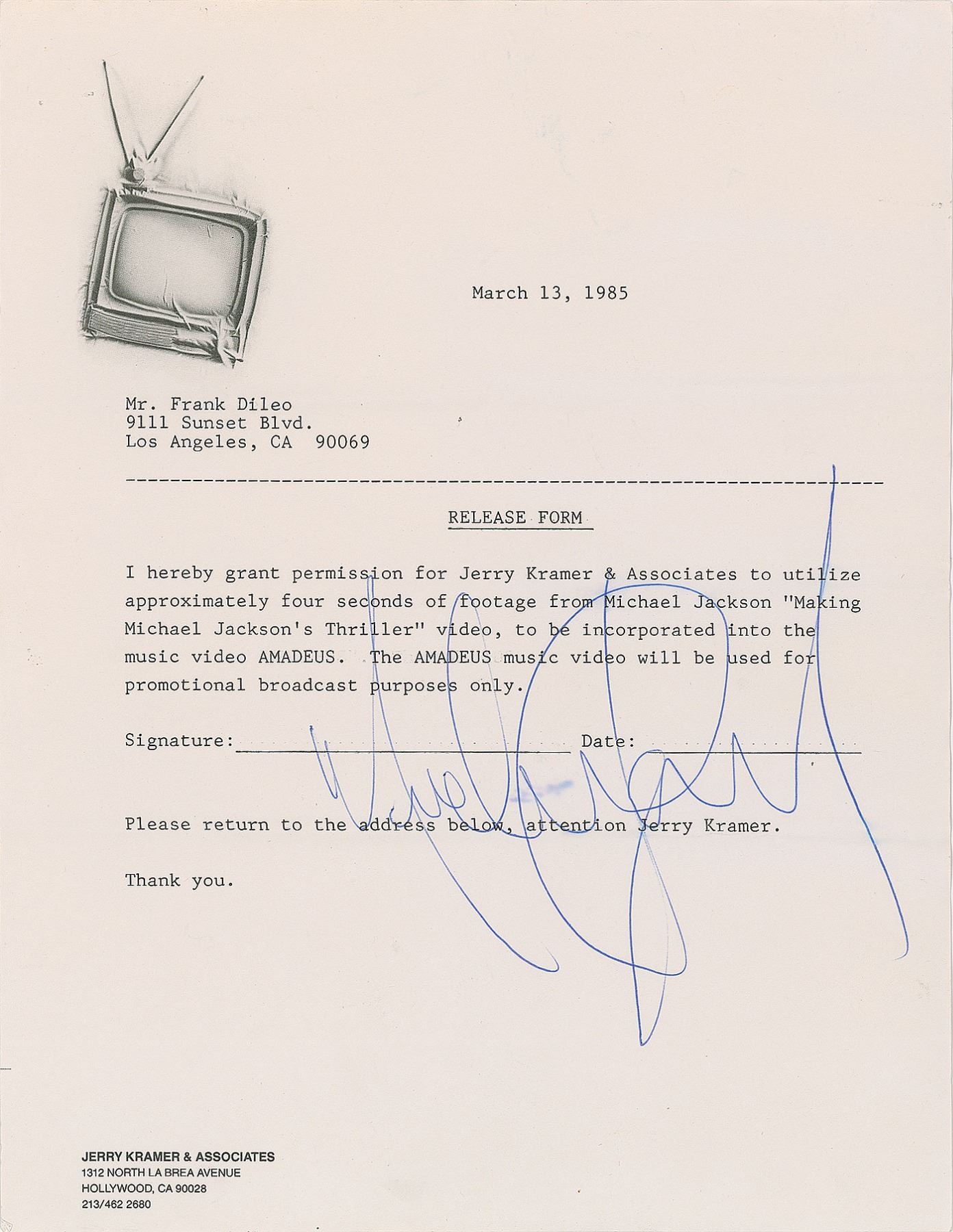 DS, one page, 8.5 x 11, March 13, 1985. A release form sent to his manager Frank DiLeo, in full: "I hereby grant permission for Jerry Kramer & Associates to utilize approximately four seconds of footage from Michael Jackson 'Making Michael Jackson's Thriller' video, to be incorporated into the music video Amadeus. The Amadeus music video will be used for promotional broadcast purposes only." In fine condition, with scattered light creasing and a light stain at the center of the signature. Released in tandem with the iconic 'Thriller' music video, 'Making Michael Jackson's Thriller' was an hour-long documentary that provided candid behind-the-scenes glimpses of the video's production. A fantastic document associated with Jackson's famed music video.