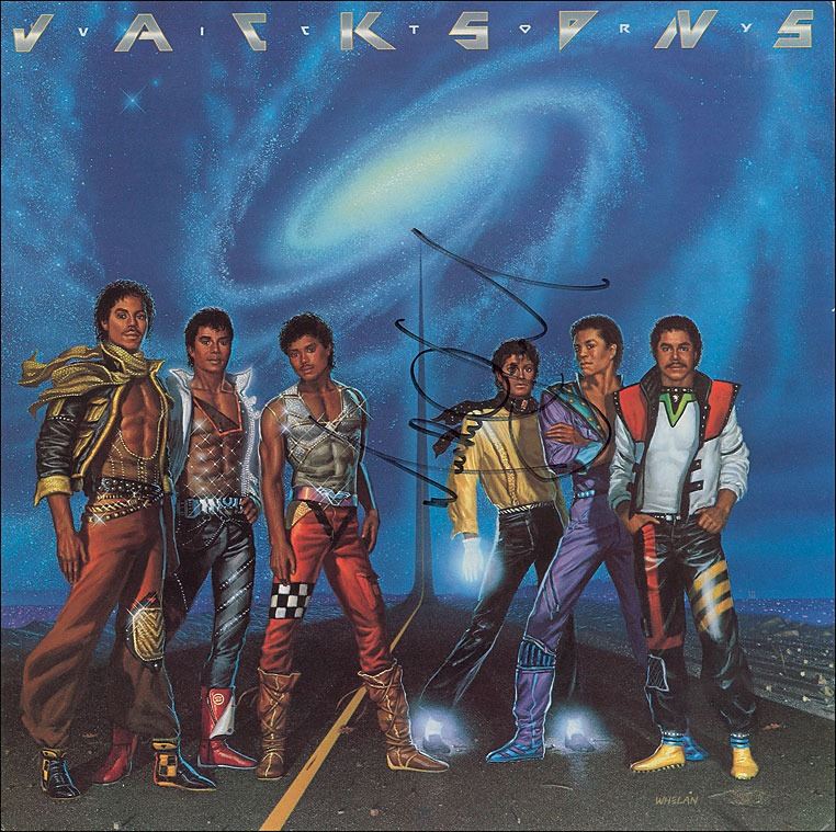 Victory album by the Jacksons signed vertically on the front in black felt tip, “Michael Jackson.” In fine condition, with some edge and corner wear. The record is not included.