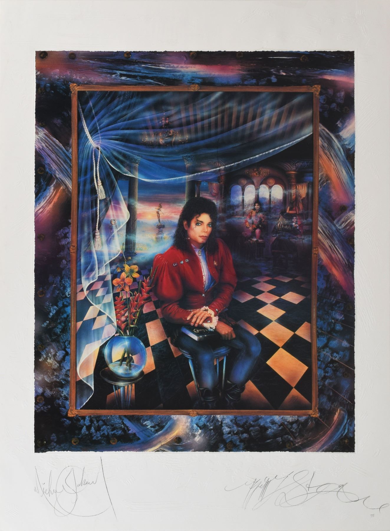 Impressive color limited edition 30 x 40 lithograph entitled 'The Book' by artist Brett Livingstone Strong, 'Japan' edition numbered 75/375, signed in the lower border in pencil by Michael Jackson and by the artist. Professionally restored to fine condition, with repairs to edge tears and surface scuffs. This famous portrait by Brett-Livingstone Strong is believed to be the only painting for which Jackson actually posed in person, and the original artwork sold for $2.1 million in 1990.