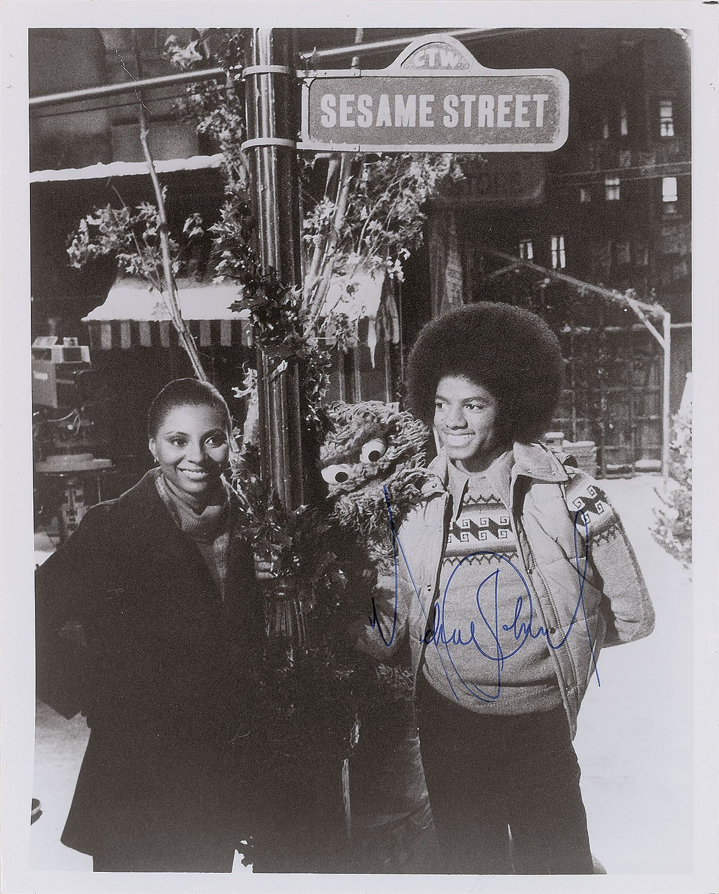 Unusual glossy 8 x 10 promotional photo of Jackson, Leslie Uggams, and Oscar the Grouch standing on a snow-covered Sesame Street, neatly signed in blue felt tip by Jackson. In very good to fine condition, with a few scattered creases. A Special Sesame Street Christmas starred Jackson alongside Uggams, Ethel Merman, Anne Murray, Dick Smothers, Imogene Coca, and Henry Fonda.