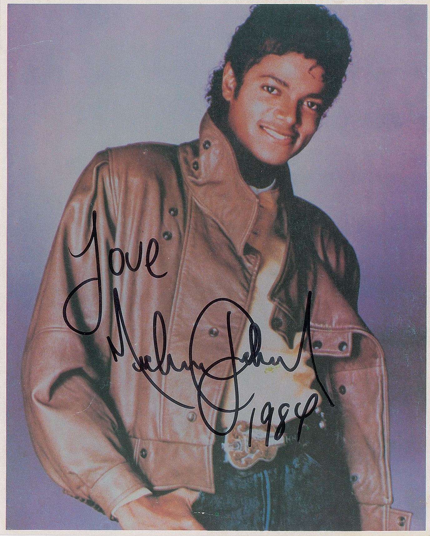 Color 8 x 10 cardstock photo of Jackson in a leather jacket during the Thriller era, boldly signed in black felt tip, "Love, Michael Jackson, 1984." In fine condition, with a few light surface creases.