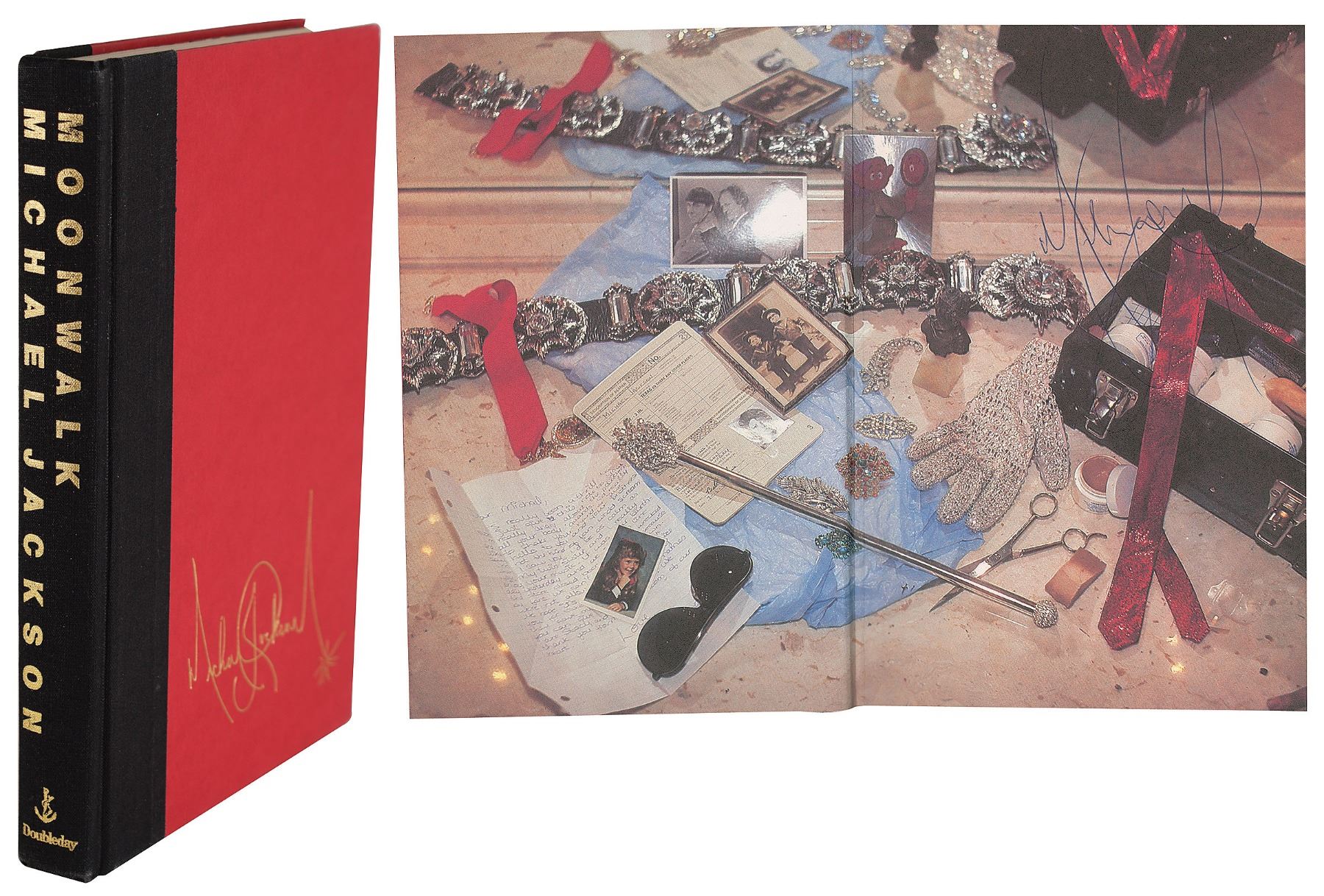 Signed book: Moonwalk. First edition. NY: Doubleday, 1988. Hardcover, 6.25 x 9.25, 283 pages. Signed on the colorful first free end page in ballpoint by Michael Jackson. In fine condition. Accompanied by a cloth backstage pass for Jackson's 1987–88 world tour, plus a photograph of the backstage meet-and-greet.