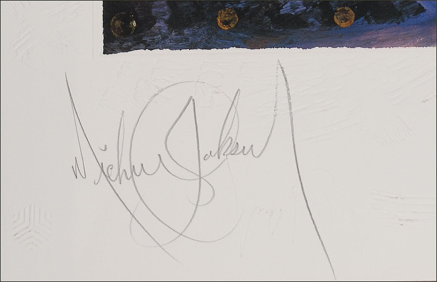 Impressive limited edition color 30 x 40 lithograph entitled 'The Book' by artist Brett-Livingstone Strong, 'Japan' edition, numbered 336/375, signed in the lower border in pencil by Michael Jackson and by the artist. In fine condition. Accompanied by its original certificate of authenticity, bearing printed signatures of Jackson and Strong. This famous portrait by Brett-Livingstone Strong is believed to be the only painting for which Jackson actually posed in person, and the original artwork sold for $2.1 million in 1990.