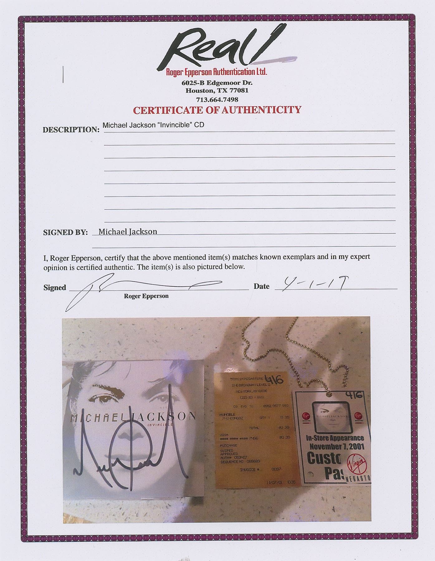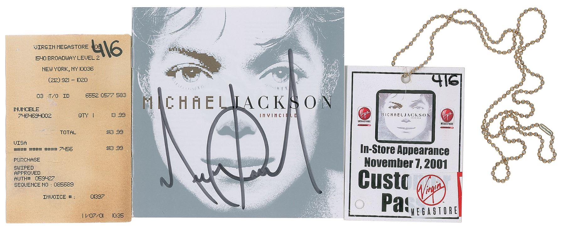 Invincible CD booklet, signed in person in black felt tip by Michael Jackson. In fine condition. Accompanied by a customer pass for Jackson's in-store appearance at the NYC Virgin Megastore on November 7, 2001, a receipt for the purchase of the Invincible CD of the same date, and a full letter of authenticity from REAL.