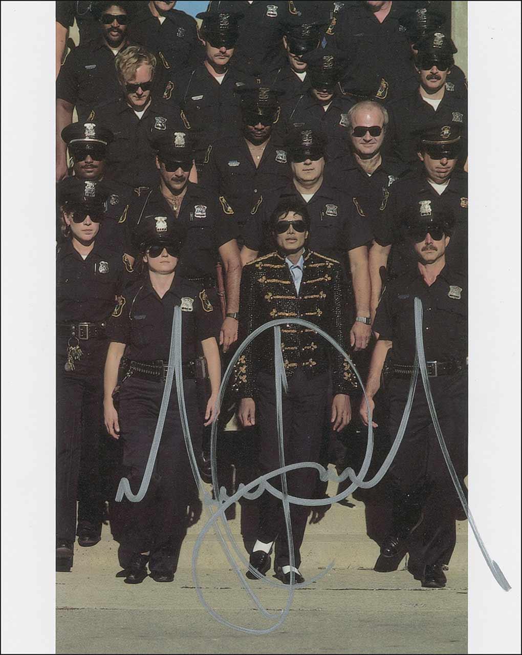 Color satin-finish 8 x 10 photo of Jackson posing on a flight of stairs with a number of police officers, signed in silver ink. In very fine condition.