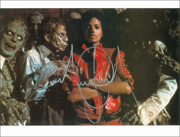Color satin-finish 14 x 11 photo of Jackson surrounded by zombies on the set of his Thriller video, signed in silver ink. In very fine condition. Pre-certified Roger Epperson/REAL and RRAuction COA.