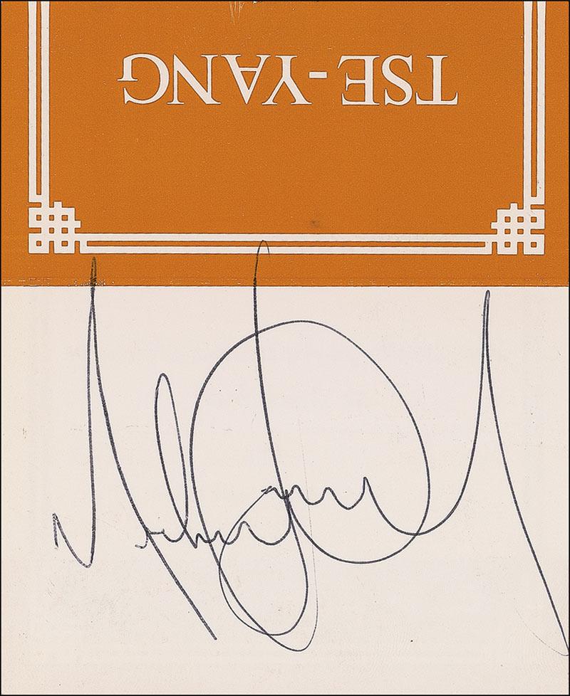 Ballpoint signature, “Michael Jackson,” on the reverse of an off-white 3.5 x 4.25 promotional card for a high class Chinese restaurant in Paris. In fine condition, with a light horizontal crease through the tops of a few letters of signature.
