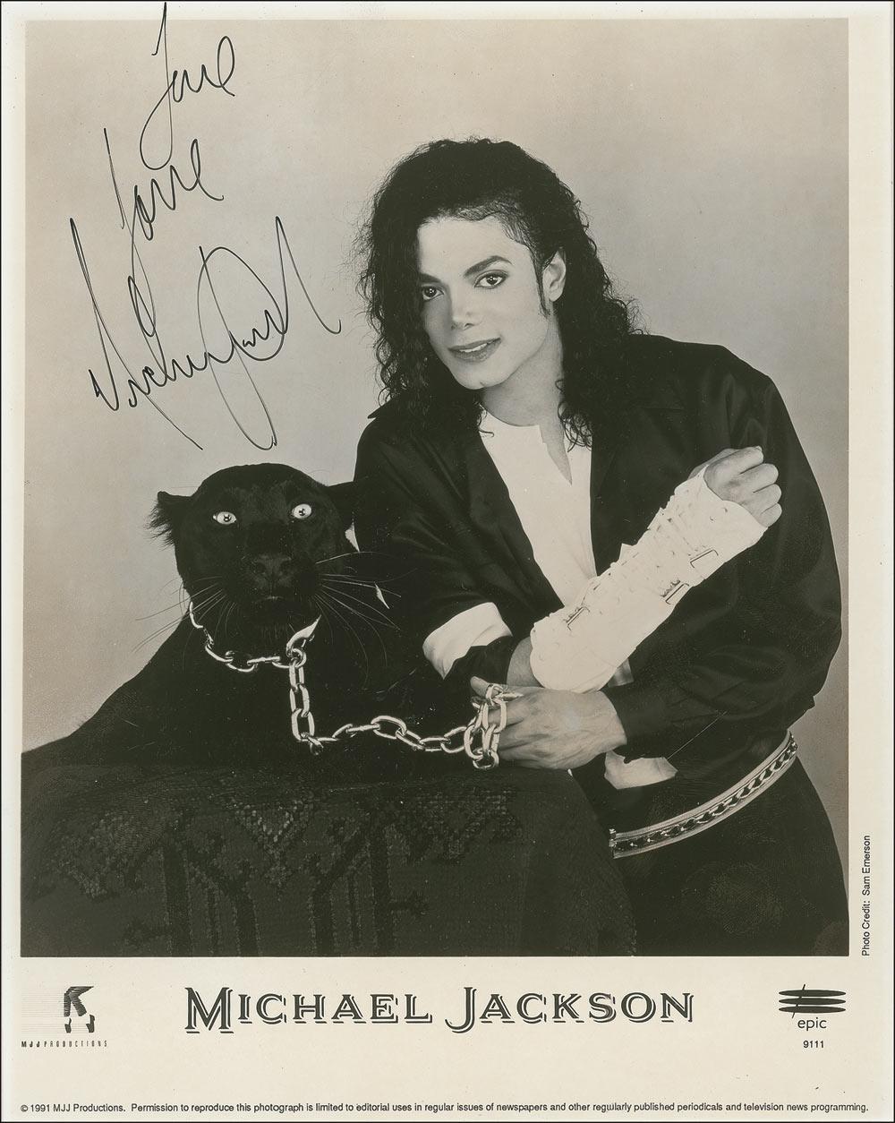 Glossy 8 x 10 Epic Records promotional photo of Jackson posing with a panther, signed in black felt tip, “Love, love, Michael Jackson.” Matted to an overall size of 10 x 12. In fine condition, with a uniform shade of mild overall toning.