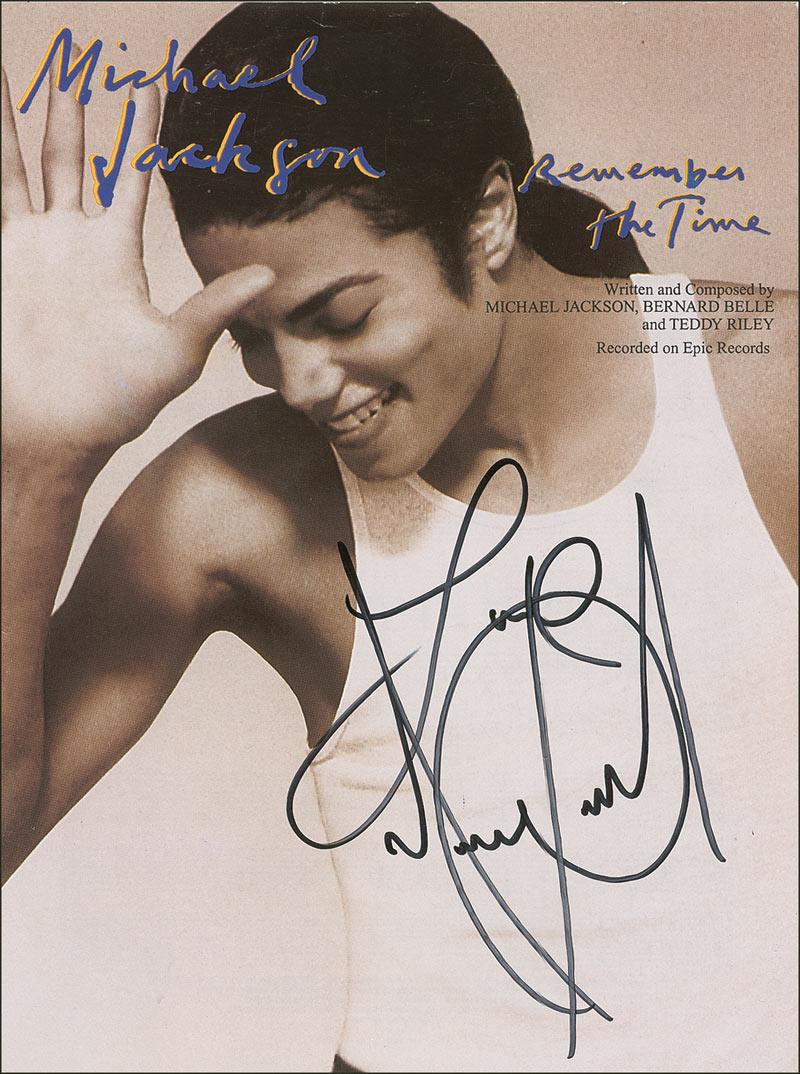 Sheet music for ‘Remember the Time,’ 9 x 12, 6 pages, signed on the front cover in black felt tip, “Love, Michael Jackson.” In fine condition.