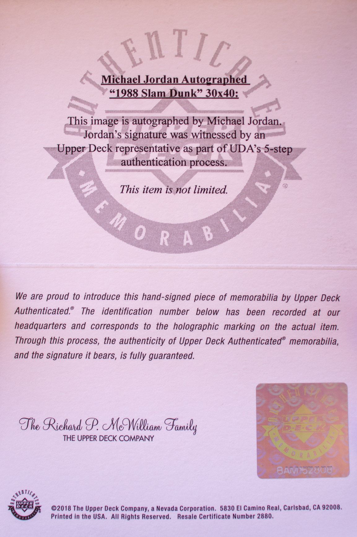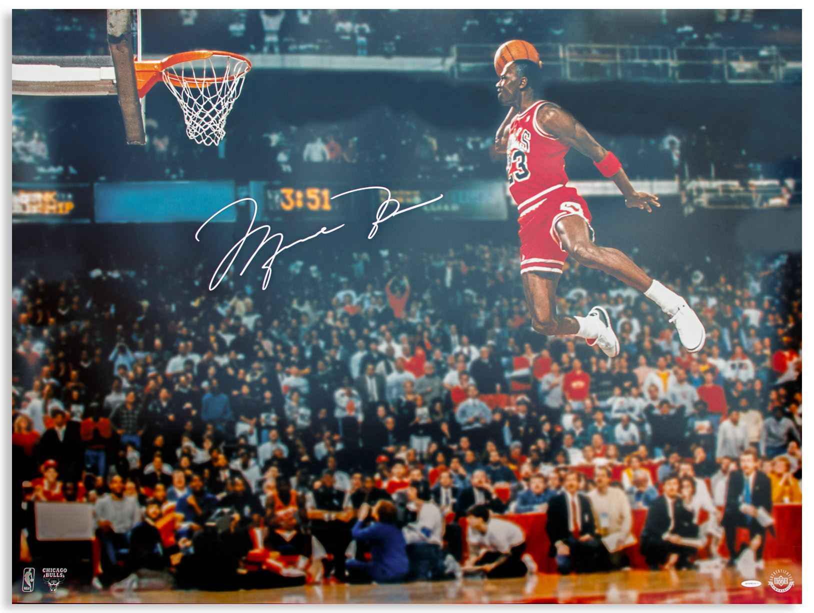 Michael Jordan signed photo measuring 40'' x 30'' over three feet long, showing Jordan sailing through the air about to score a perfect slam dunk at the 1988 Slam Dunk Contest. Jordan's performance, at the height of his prowess, had literally raised the bar for basketball that day. Prominently signed by Jordan in silver felt-tip across the satin-finish photo, in flawless, near fine condition. With Upper Deck COA.