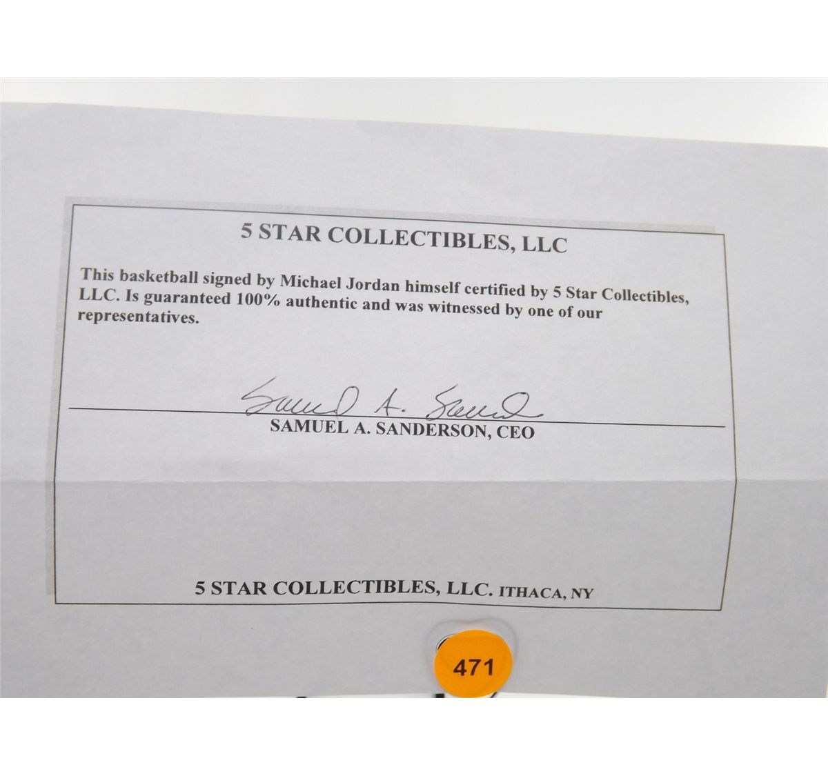Michael Jordan Autographed Basketball. Spalding Tip-Off Ball. Appraised or estimated retail value $1200. COA by 5-Star Collectibles, LLC. All Sales Final. Please see terms and conditions of auction.