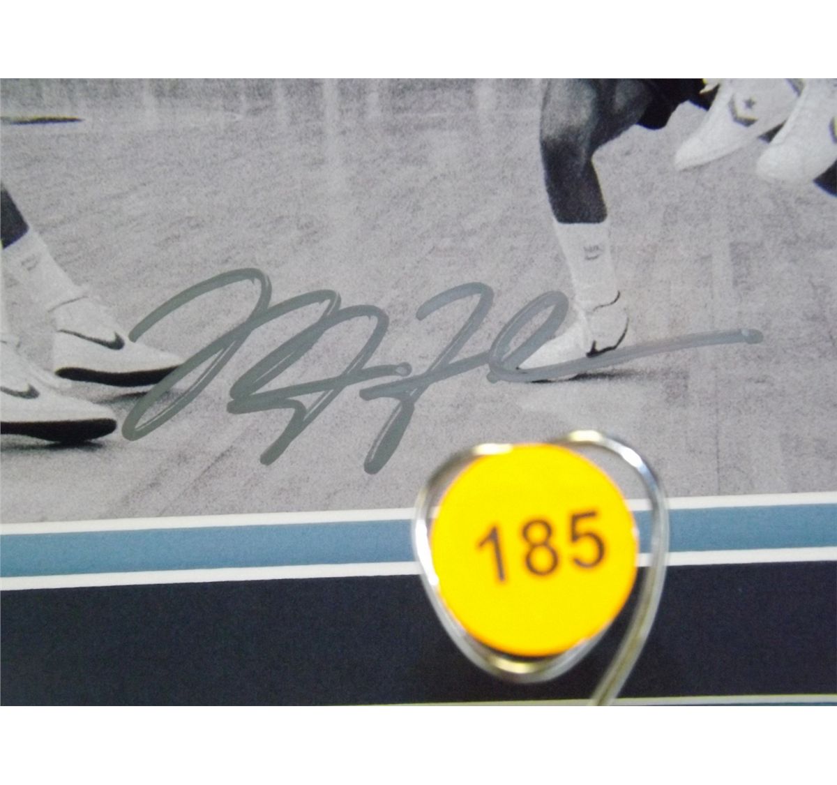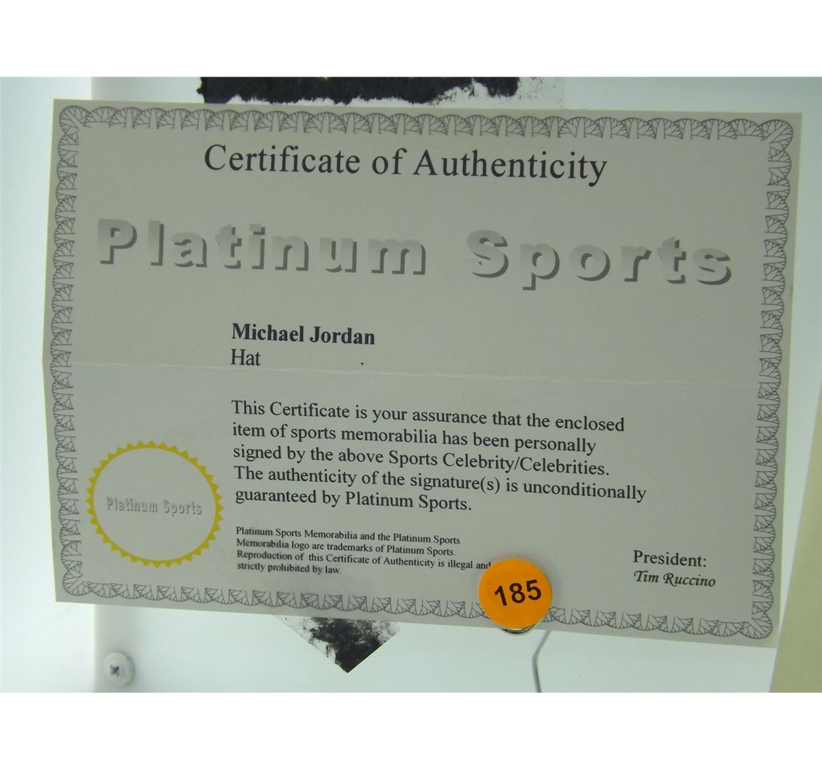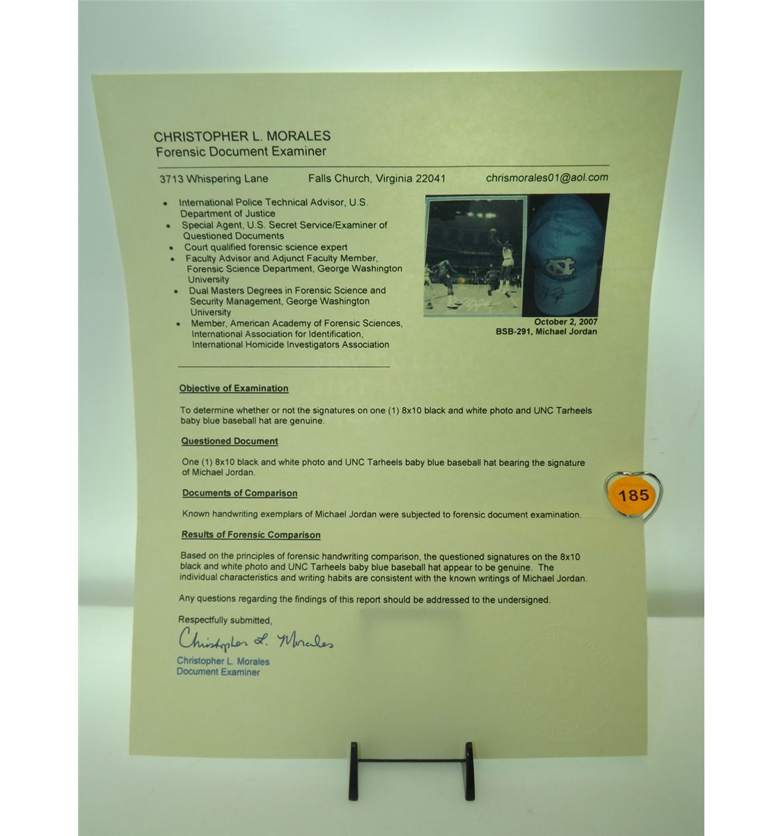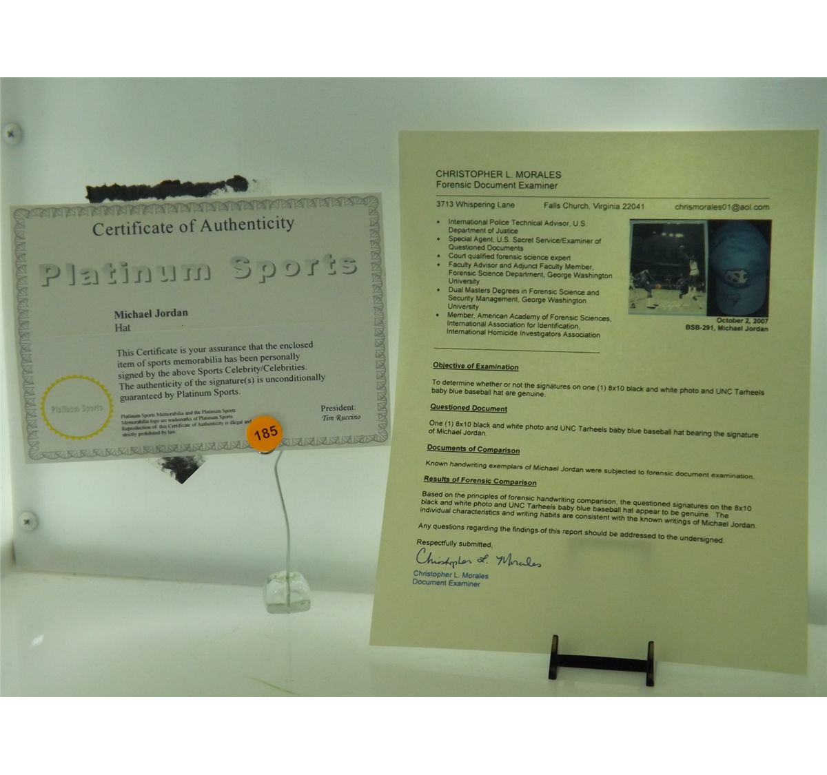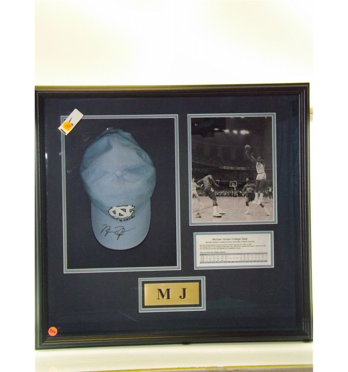 Michael Jordan Autographed College Shadowbox. Contains College Cap, Photo and College Stats Sheet. Appraised or estimated retail value $2500. COA by Christopher Morales & Platinum Sports. All Sales Final. Please see terms and conditions of auction.