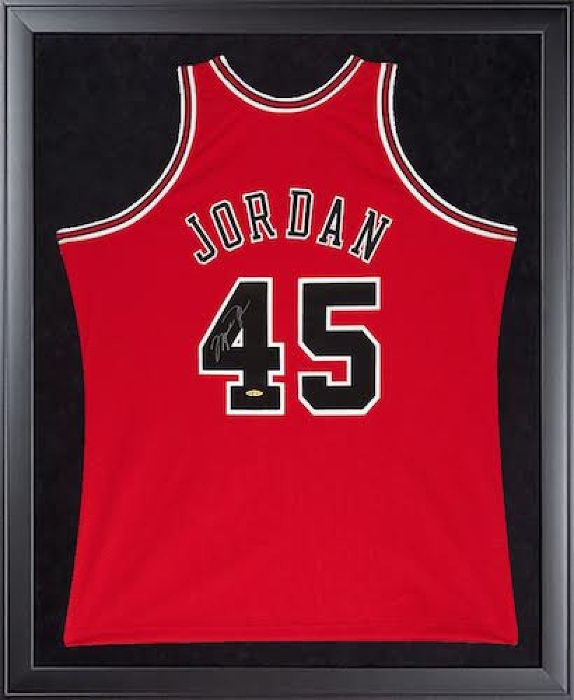 Custom frame measures 32" x 44" and features an authentic Mitchell and Ness jersey which has been hand-signed in silver paint pen by Michael Jordan (HOF).Â
