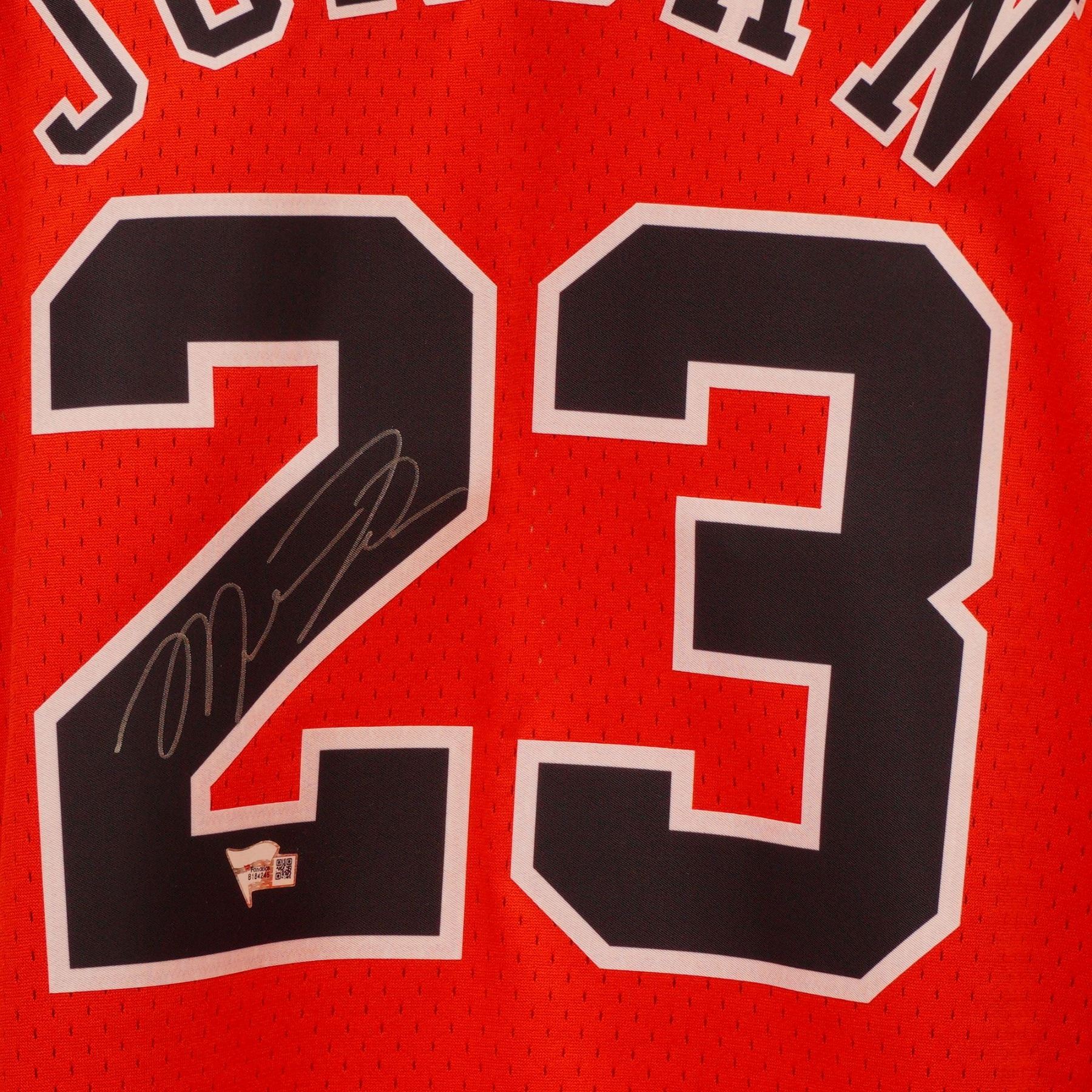 This authentic Chicago Bulls red jersey features the 1997-98 Michael Jordan tag and Hardwood Classics label on the lower right, representing the season of Jordan's final championship with the Bulls. The jersey displays the iconic number 23 and Jordan name across the back, personally signed by Michael Jordan in silver ink on the number 2. Authenticated by Fanatics Authentic with a tamper-evident hologram and certificate, the jersey is made of classic red mesh with detailed team and NBA embroidery. A rare and desirable collectible commemorating the peak of Jordan's legendary career, perfect for serious sports memorabilia collectors. Size XL.
