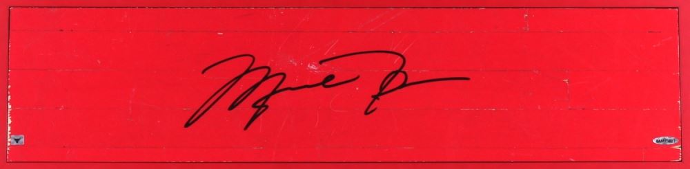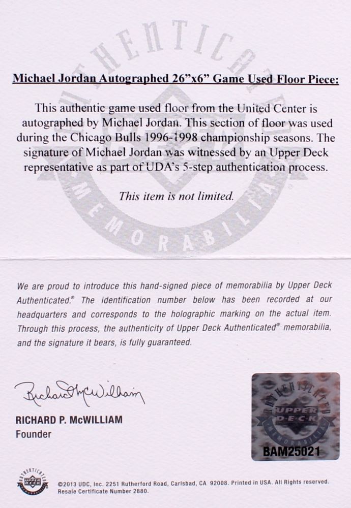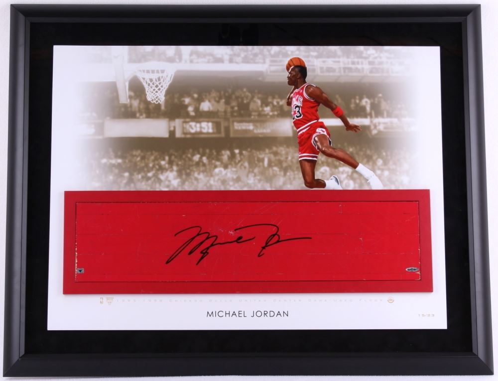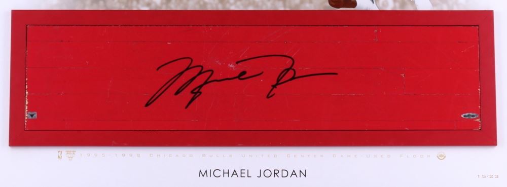 Custom framed photo display measures 26" x 36" in size and features a 6" x 26" authentic game-used floor piece that is hand-signed in black felt-tip pen by Michael Jordan (Bulls HOF). Limited Edition #15 / 23.