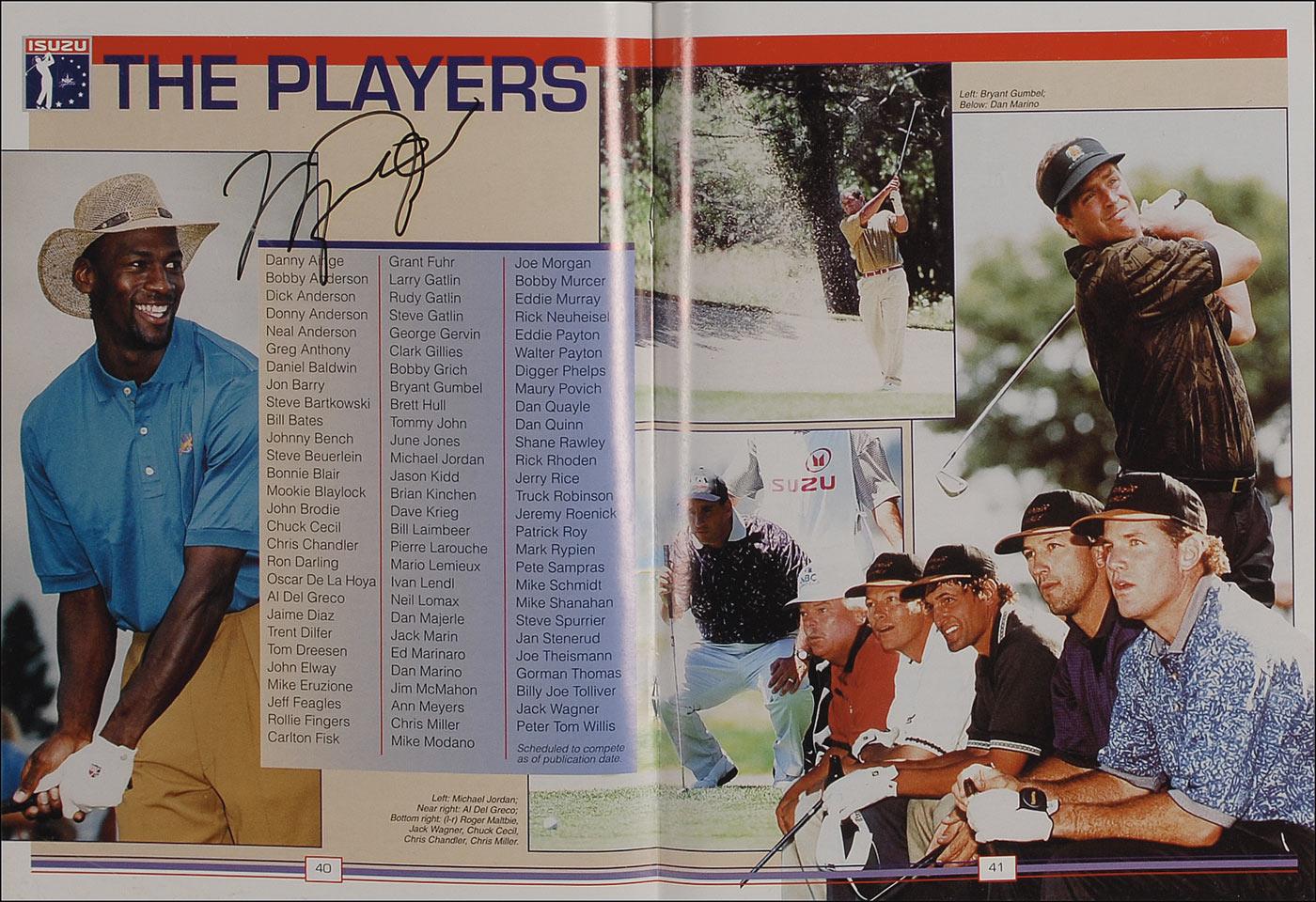 Isuzu Celebrity Golf Championship program from 1996, 8.5 x 11, 80 pages. Signed inside in felt tip by Michael Jordan, Bobby Grich, Don Quinn, Mark Rypien, Pete Sampras, and Mike Schmidt. Scattered creasing to both covers, otherwise fine condition. Accompanied by a full letter of authenticity from PSA/DNA.