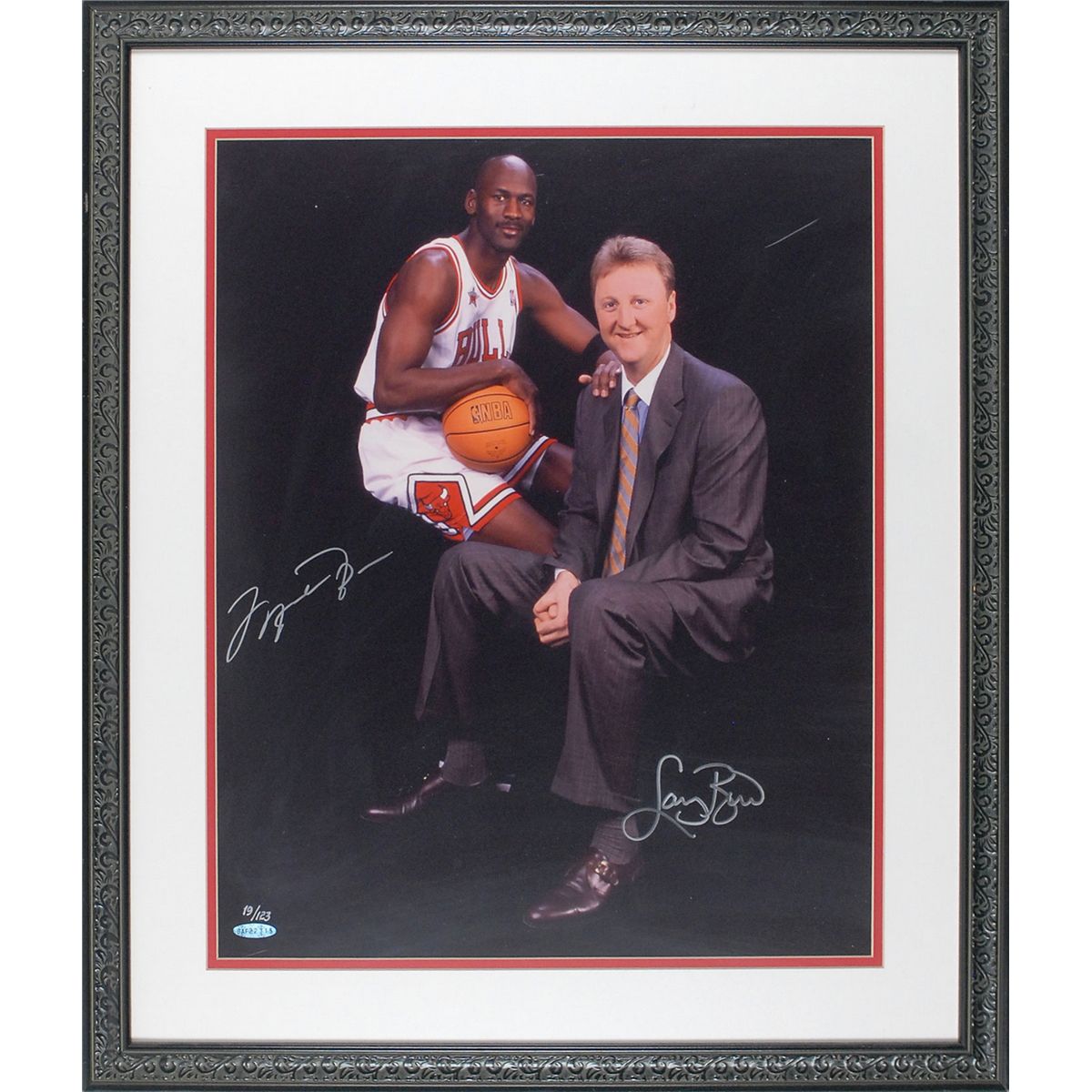 Limited edition color satin-finish 15.5 x 19 photo of Bird in a suit and tie and Jordan in his Bulls uniform, numbered 19/123, signed in silver ink by both. Double-matted and framed to an overall size of 22 x 26. In fine condition, with an Upper Deck authentication label affixed to the lower left. Accompanied by a certificate of authenticity from Upper Deck. Oversized.