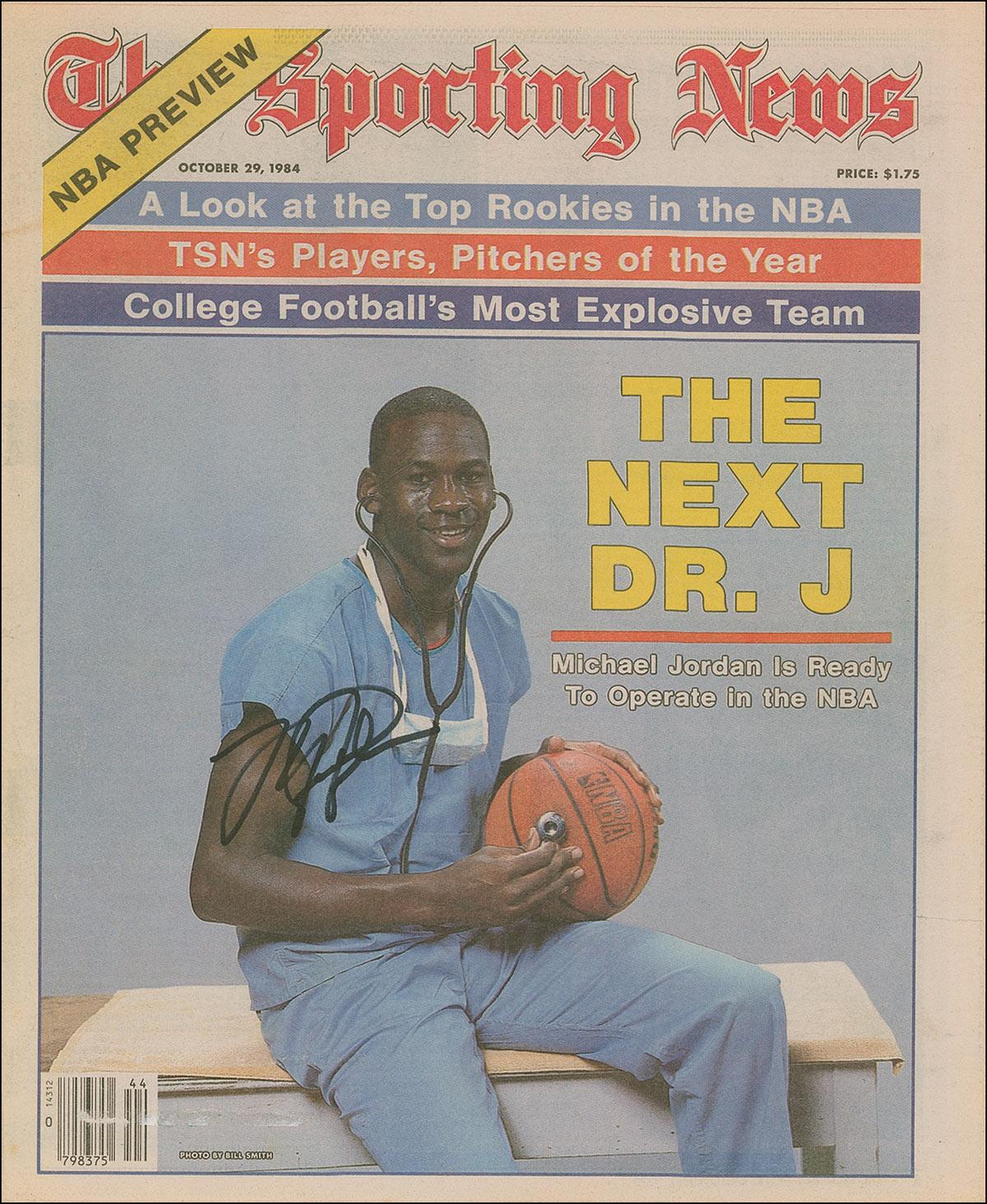 Sporting News magazine, dated October 29, 1984, featuring Jordan in surgical garb, and the headline proclaiming him the “Next Dr. J.,” signed on the cover in black felt tip. In fine condition.