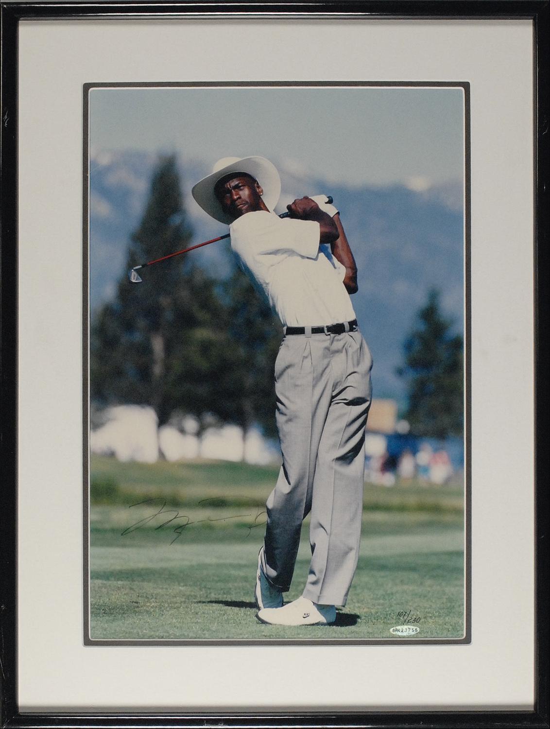 Limited edition color satin-finish 16 x 20 photo of Jordan on the golf course following his iron shot, #107/230, signed in black felt tip. Double matted and framed to an overall size of 19 x 25. Jordan’s signature light, but legible, otherwise fine condition. Accompanied by a certificate of authenticity from Upper Deck.