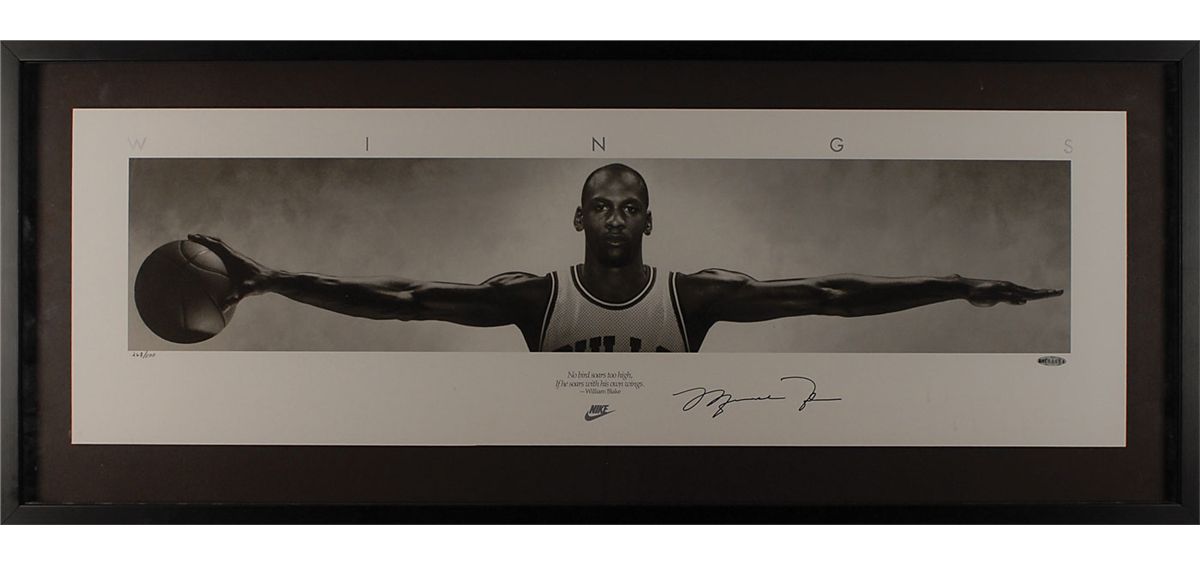 Limited edition 35.5 x 11 Nike poster entitled Wings, numbered #268/500, signed in the lower border in black felt tip. Mounted and framed to an overall size of 41 x 16.5. In very fine condition. Accompanied by a certificate of authenticity from Upper Deck