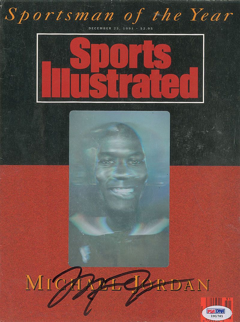 Sports Illustrated magazine, dated December 23, 1991, honoring Jordan as Sportsman of the Year, and featuring a hologram of Jordan on the cover, signed on the front cover in black felt tip by Jordan. In fine condition, with a PSA/DNA authentication label